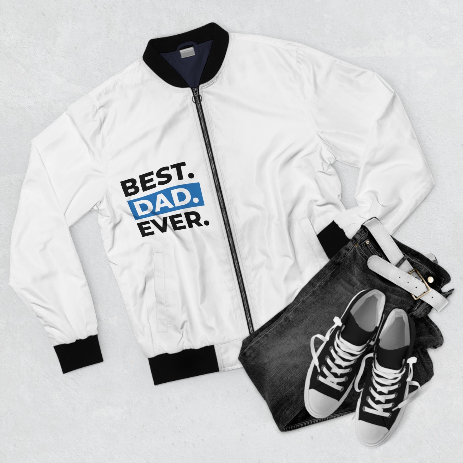 A clean, modern bomber that says what matters without shouting. Lightweight but sturdy polyester provides a smooth, all-over canvas for the bold “BEST. DAD. EVER.” chest graphic. Black rib knit cuffs, collar, and hem give a sharp contrast against the light body, while a dark blue lining and metal zipper add an understated, durable finish. Slip hands into the angled side pockets or the lined welt pockets and head out the door feeling seen — whether it’s a weekend backyard barbecue, a morning school drop-off, or a relaxed evening walk. This jacket fits into everyday rhythms: comfortable, crisp, and quietly proud.