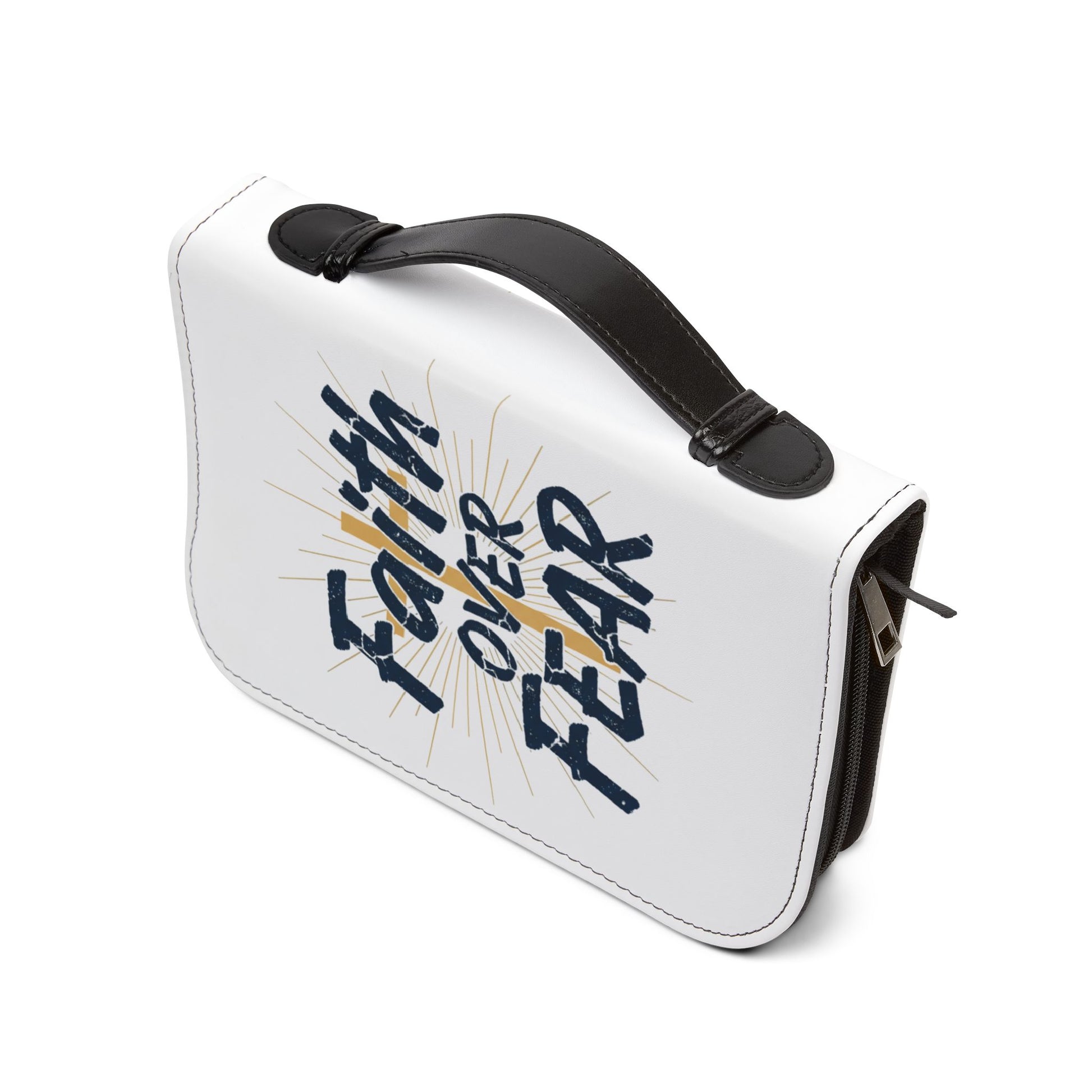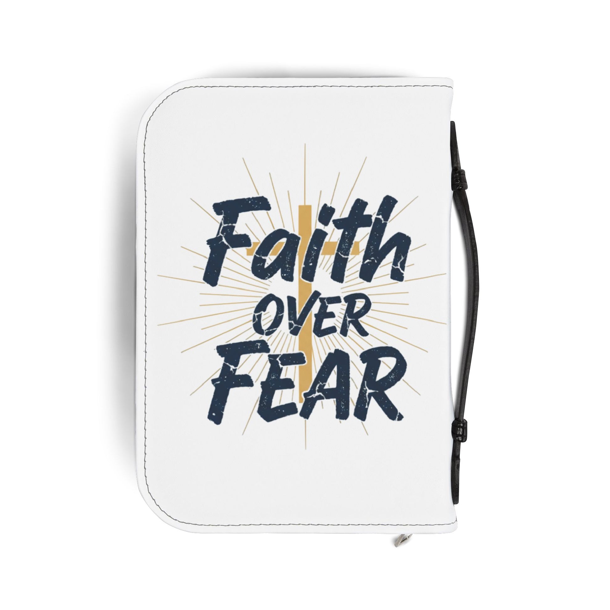A protective Bible cover designed to carry your Scripture with confidence. Soft, faux-leather exterior in clean white showcases a bold “Faith Over Fear” design with a subtle cross and sunburst motif. A secure zip closure and black handle let you take your Bible to study groups, church, or quiet moments at home. Inside, thoughtfully arranged pockets hold pens, notecards, and small devotionals so everything you need for reflection is within reach. Sized to fit most Bibles, this cover blends sturdy protection with a quiet, faith-forward message you’ll reach for again and again.