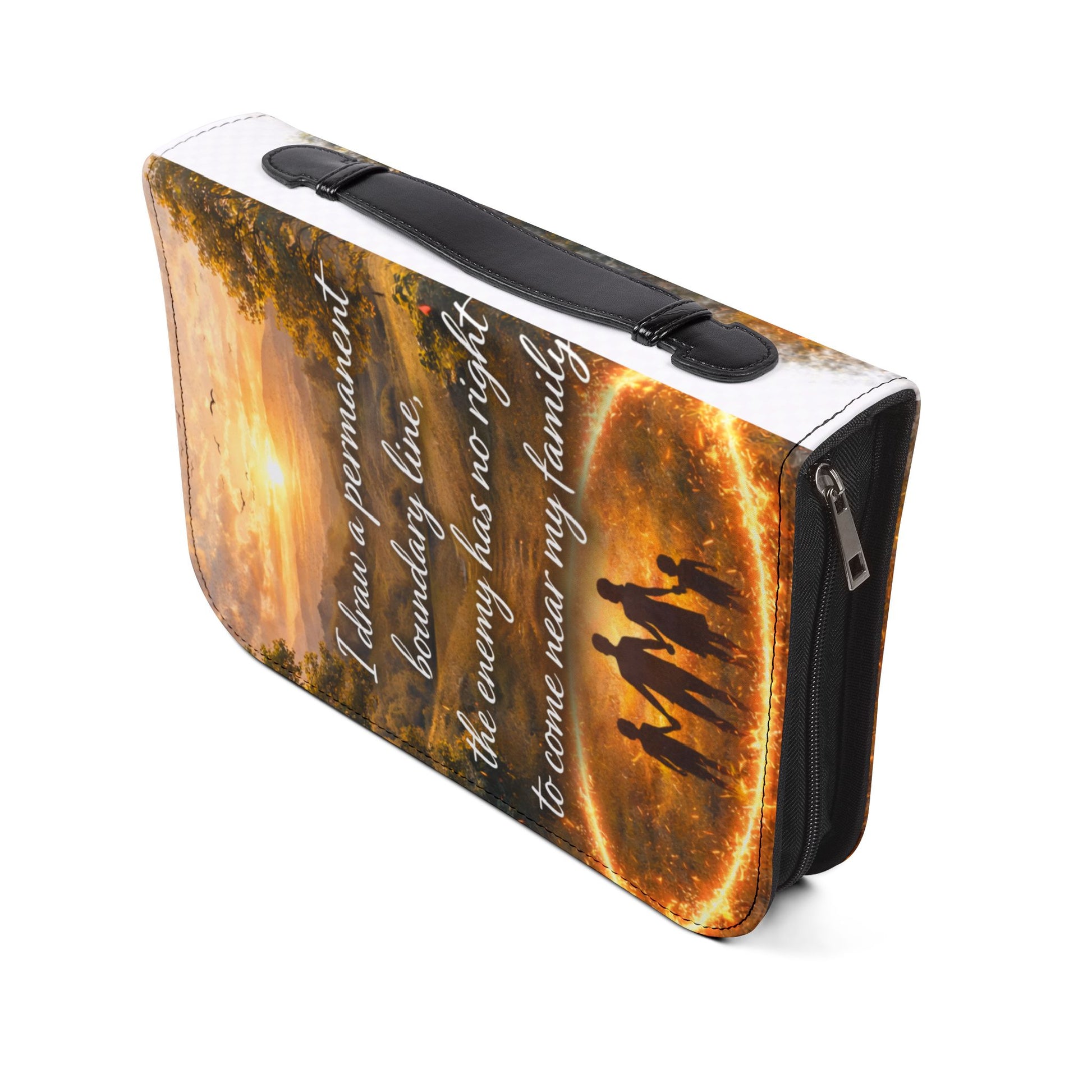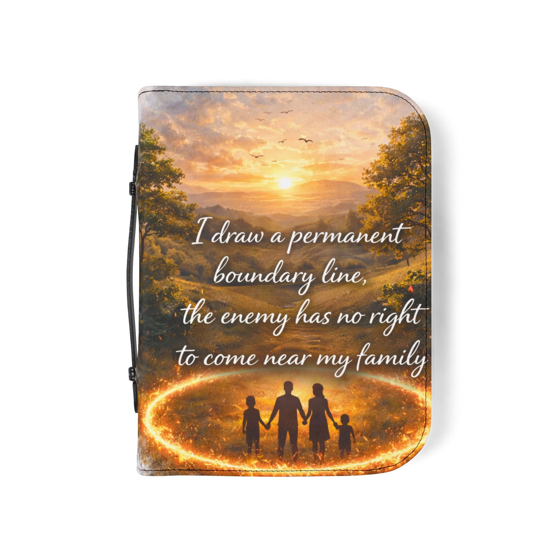 A protective Bible cover designed to carry your Scripture with confidence. Soft, faux-leather exterior in clean white showcases a bold “I Draw a Permanent Boundary Line” design with a subtle cross and sunburst motif. A secure zip closure and black handle let you take your Bible to study groups, church, or quiet moments at home. Inside, thoughtfully arranged pockets hold pens, notecards, and small devotionals so everything you need for reflection is within reach. Sized to fit most Bibles, this cover blends sturdy protection with a quiet, faith-forward message you’ll reach for again and again.