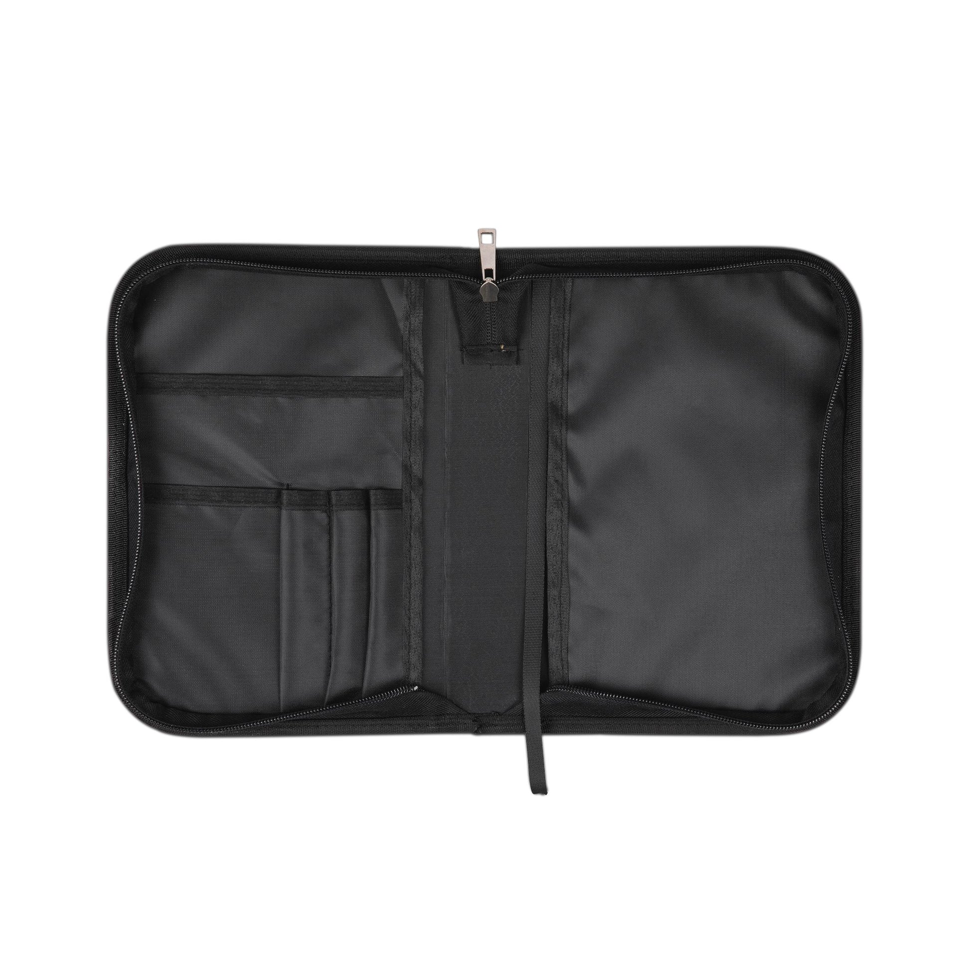 - Contrasting black interior, stitching, and zipper for a polished finish