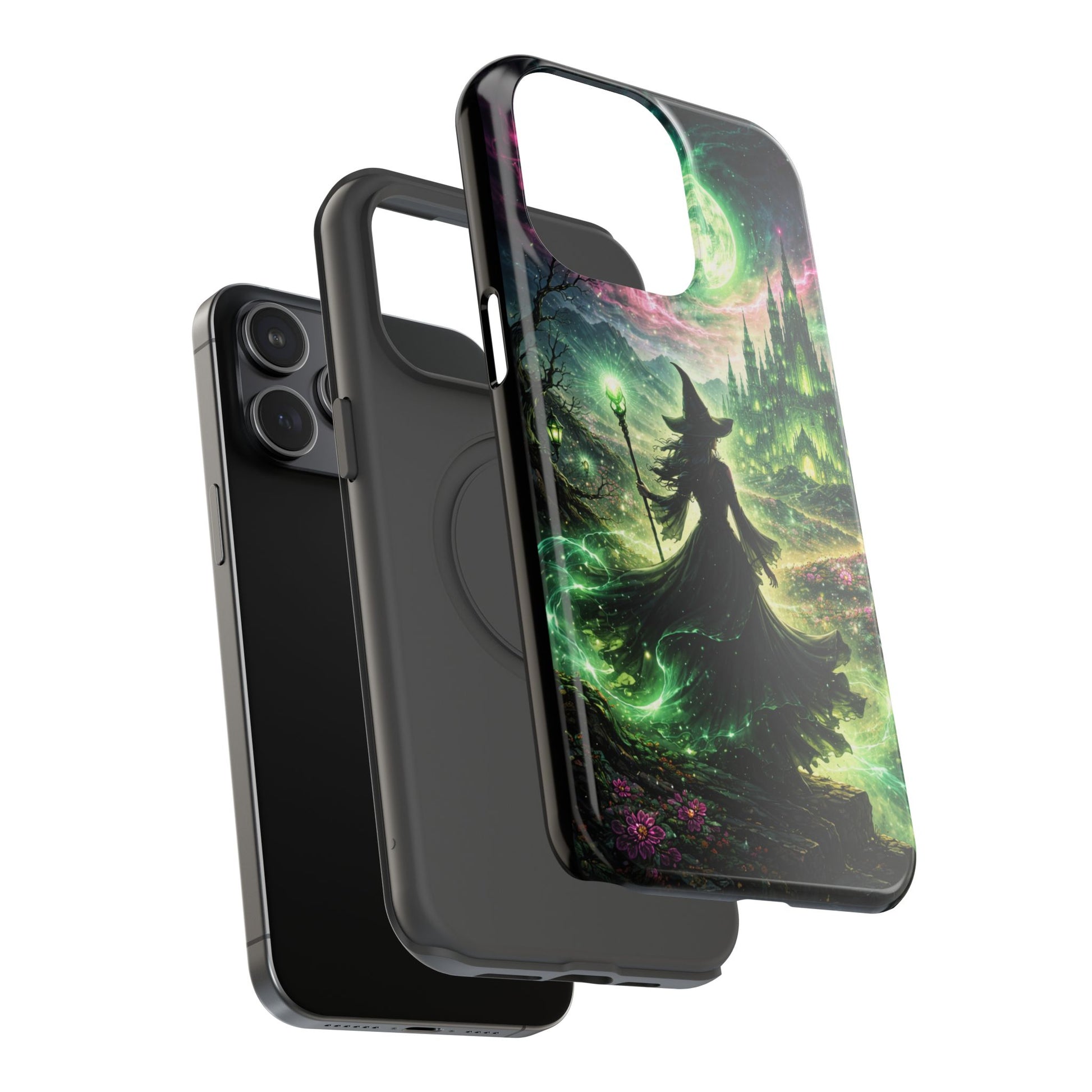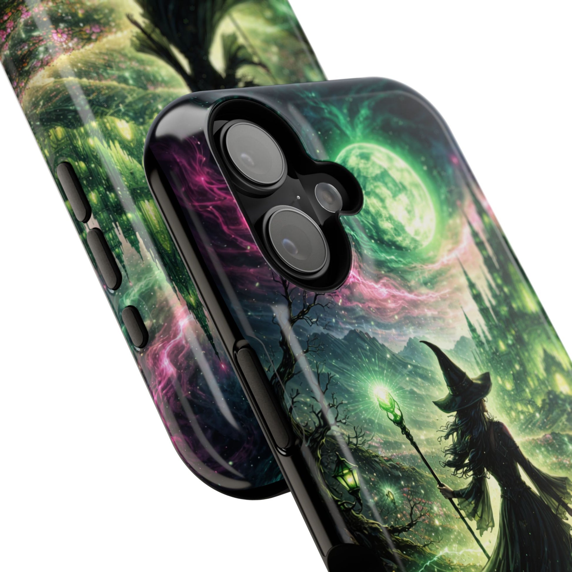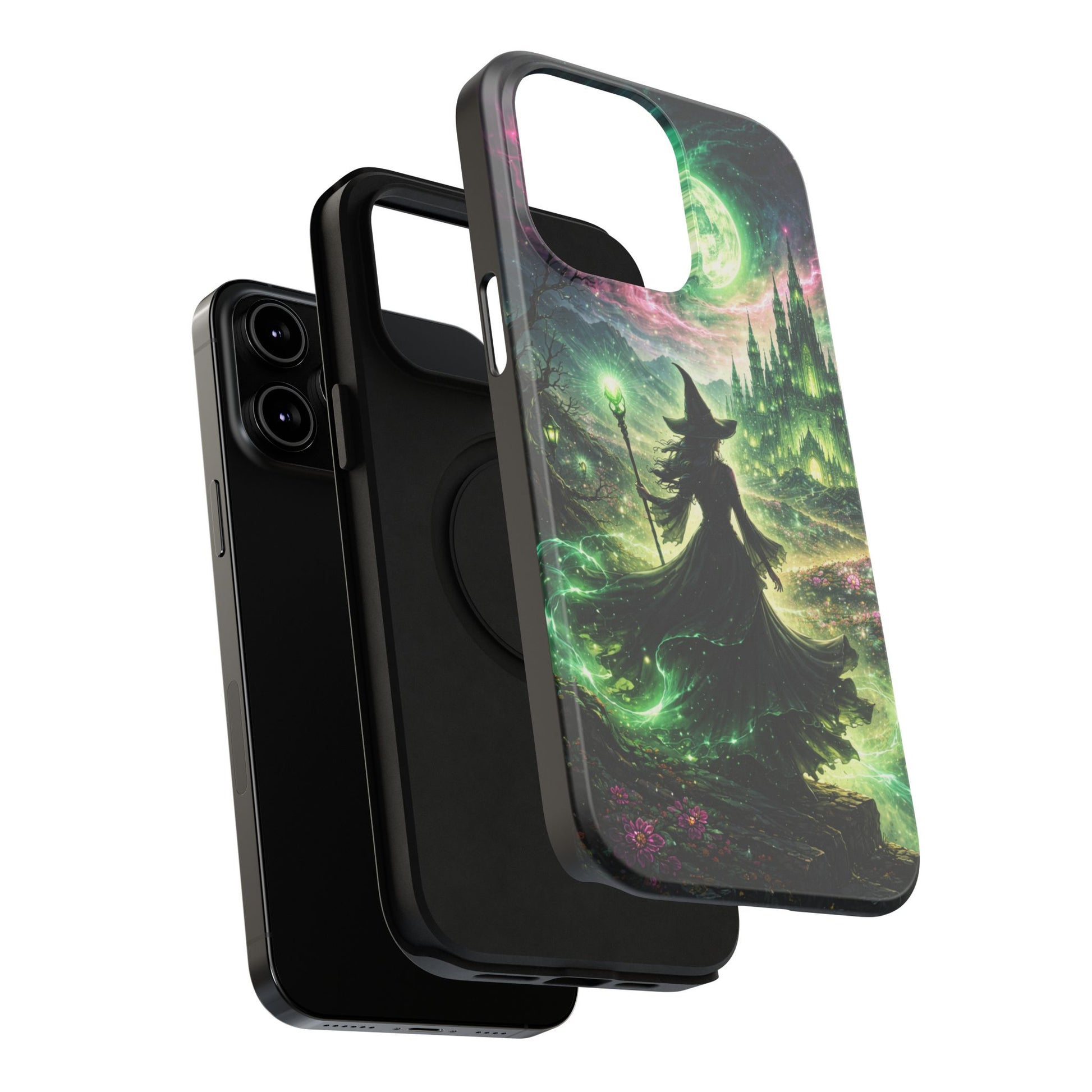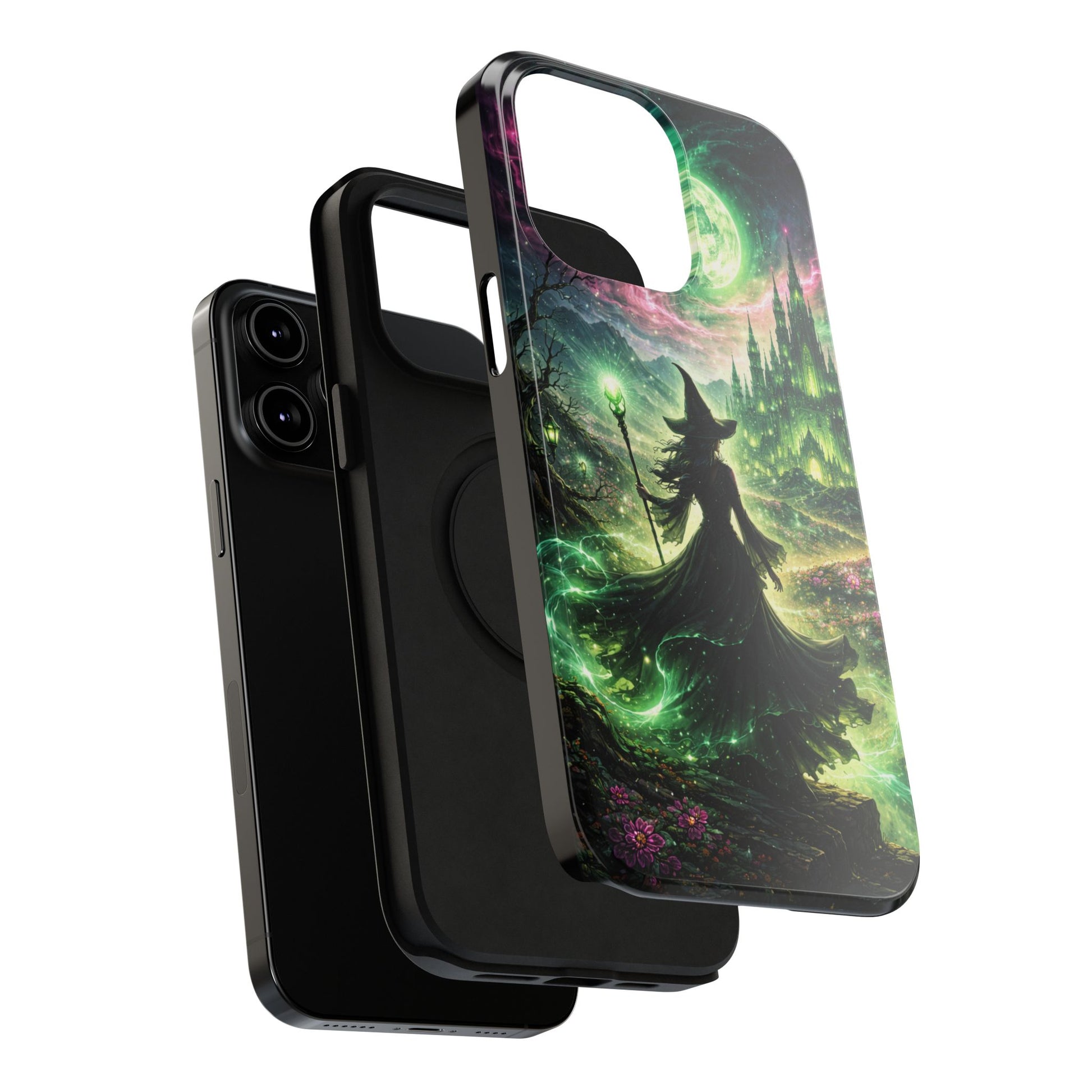 Hold a little bit of midnight magic in your hand. This impact-resistant phone case wraps your device in a swirling, witchy scene — moonlight, emerald spell trails, and a pair of mystic witches captured in jewel-toned detail. The print bleeds to the edges so the artwork feels continuous, while a snug black TPU inner layer cushions against shocks. Carry it on witch walks, forest nights, or while sketching tarot spreads at your favorite café. The glossy or matte finish options let you choose between a luminous, head-turning sheen or a softer, velvety look. Made to work with wireless charging and built for everyday life, it’s the kind of case that keeps your phone safe and your aesthetic loud.