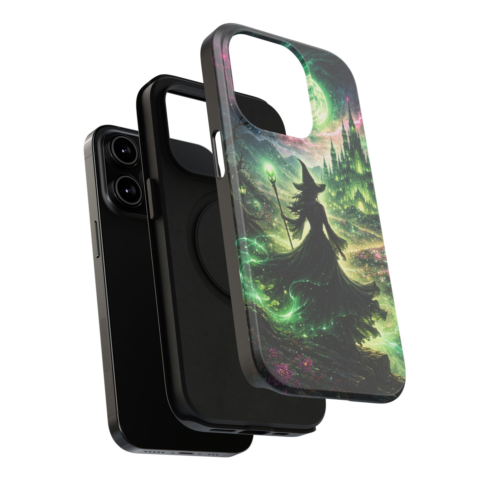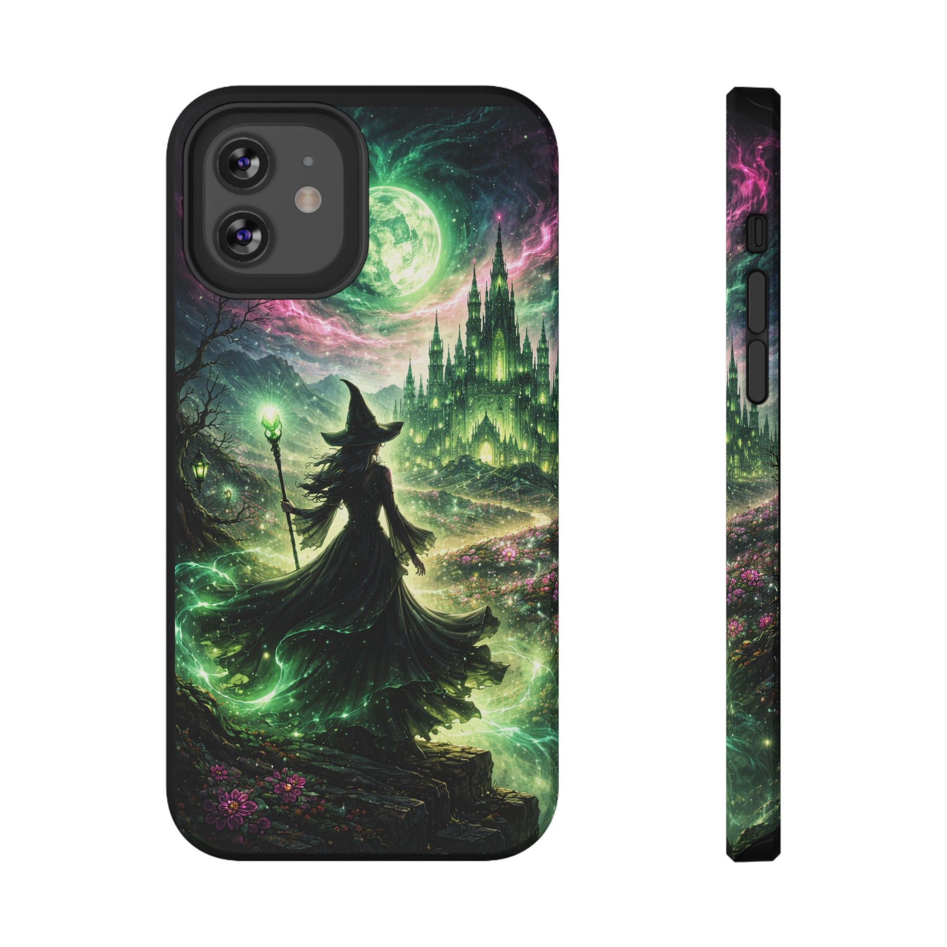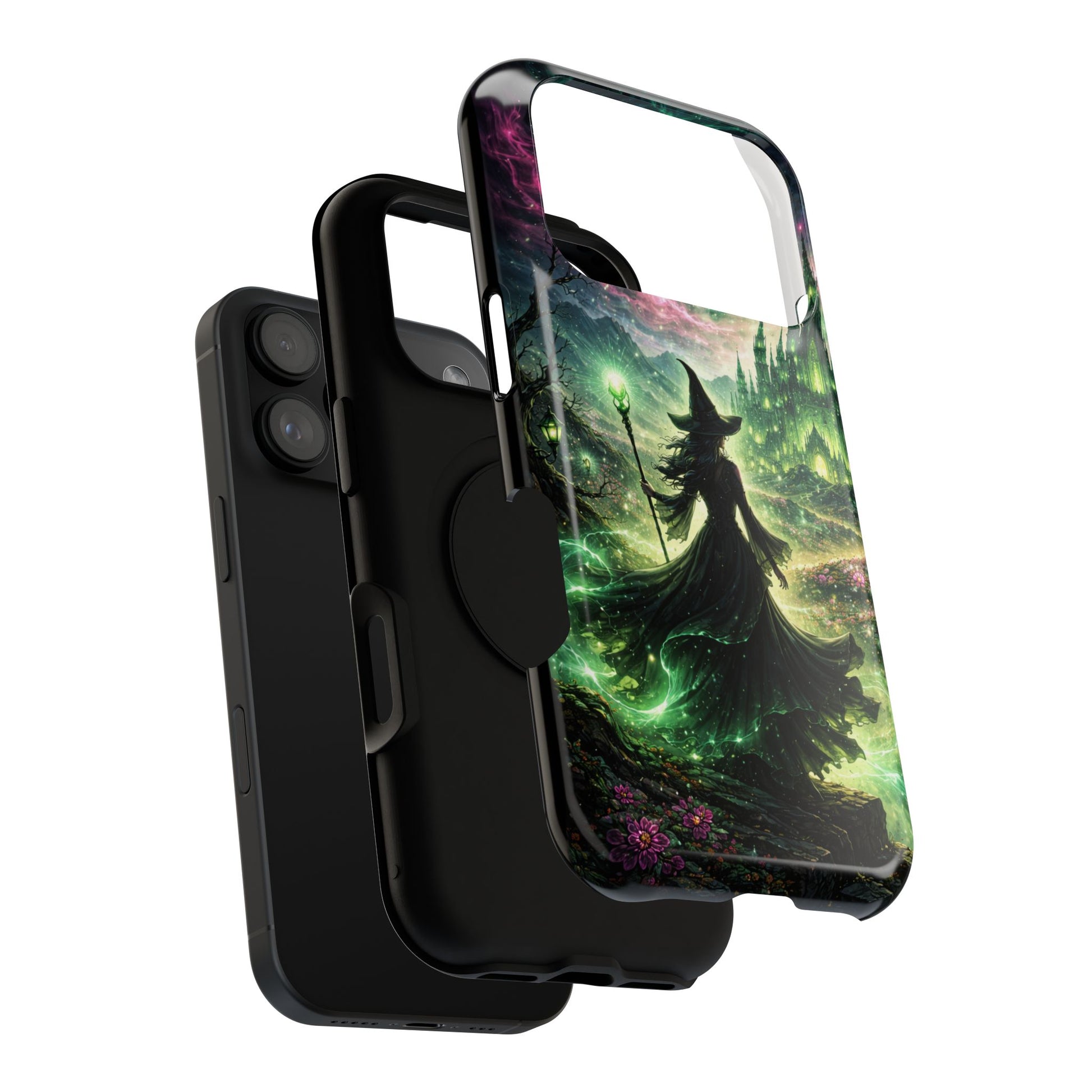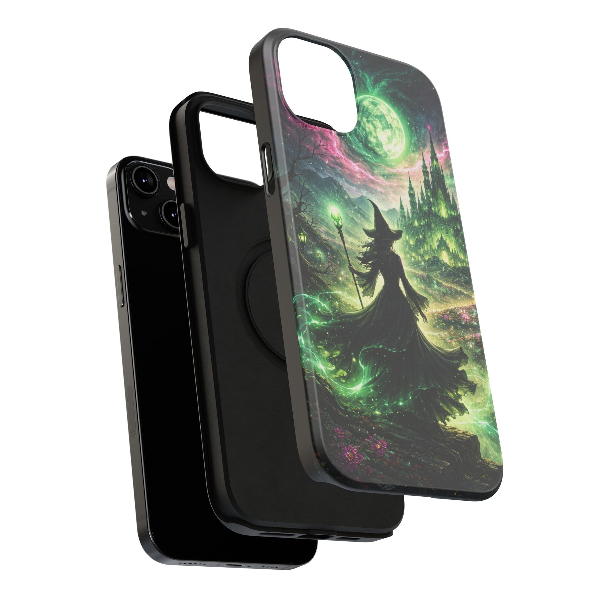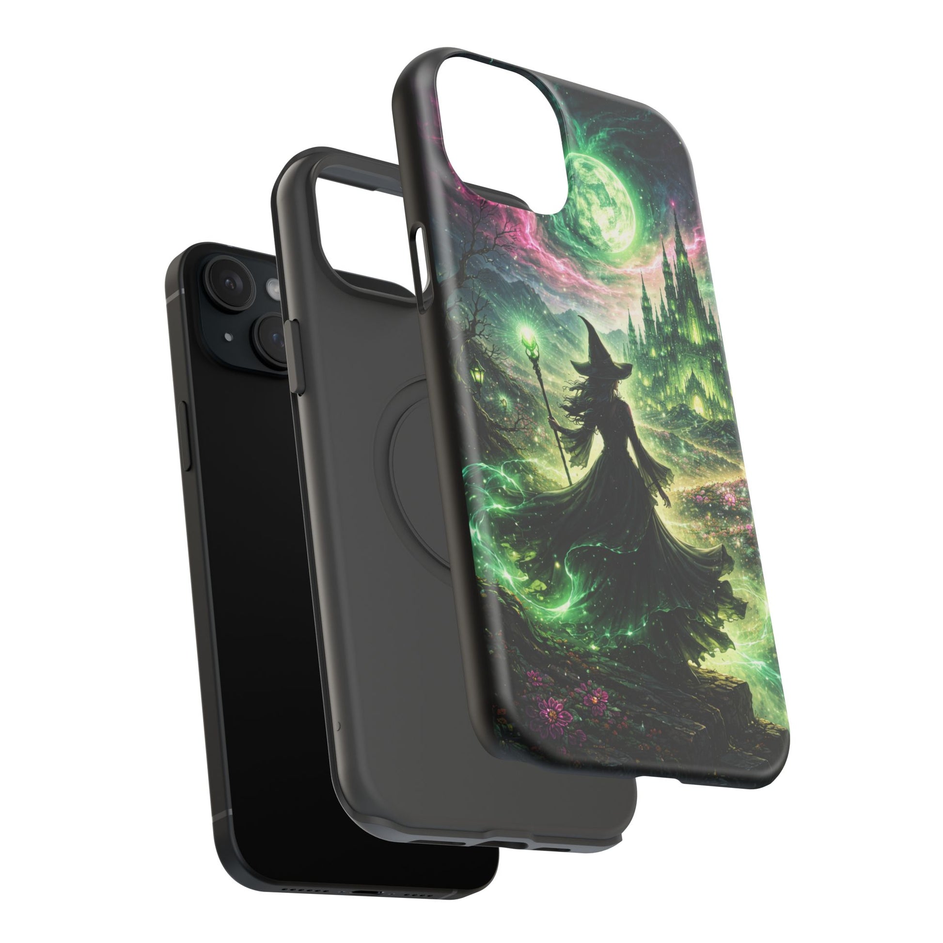 Hold a little bit of midnight magic in your hand. This impact-resistant phone case wraps your device in a swirling, witchy scene — moonlight, emerald spell trails, and a pair of mystic witches captured in jewel-toned detail. The print bleeds to the edges so the artwork feels continuous, while a snug black TPU inner layer cushions against shocks. Carry it on witch walks, forest nights, or while sketching tarot spreads at your favorite café. The glossy or matte finish options let you choose between a luminous, head-turning sheen or a softer, velvety look. Made to work with wireless charging and built for everyday life, it’s the kind of case that keeps your phone safe and your aesthetic loud.