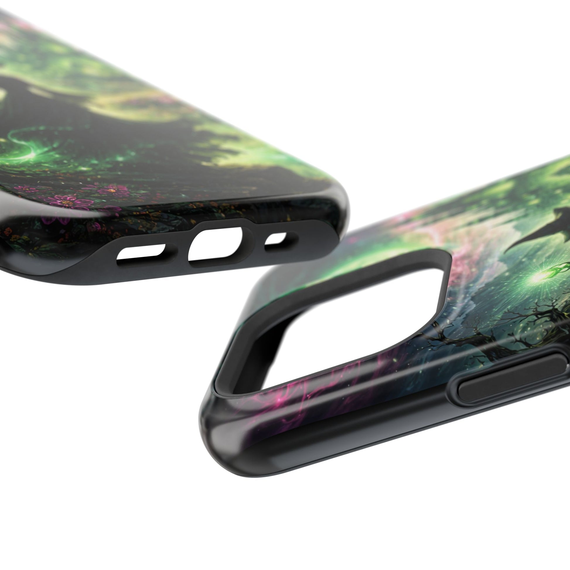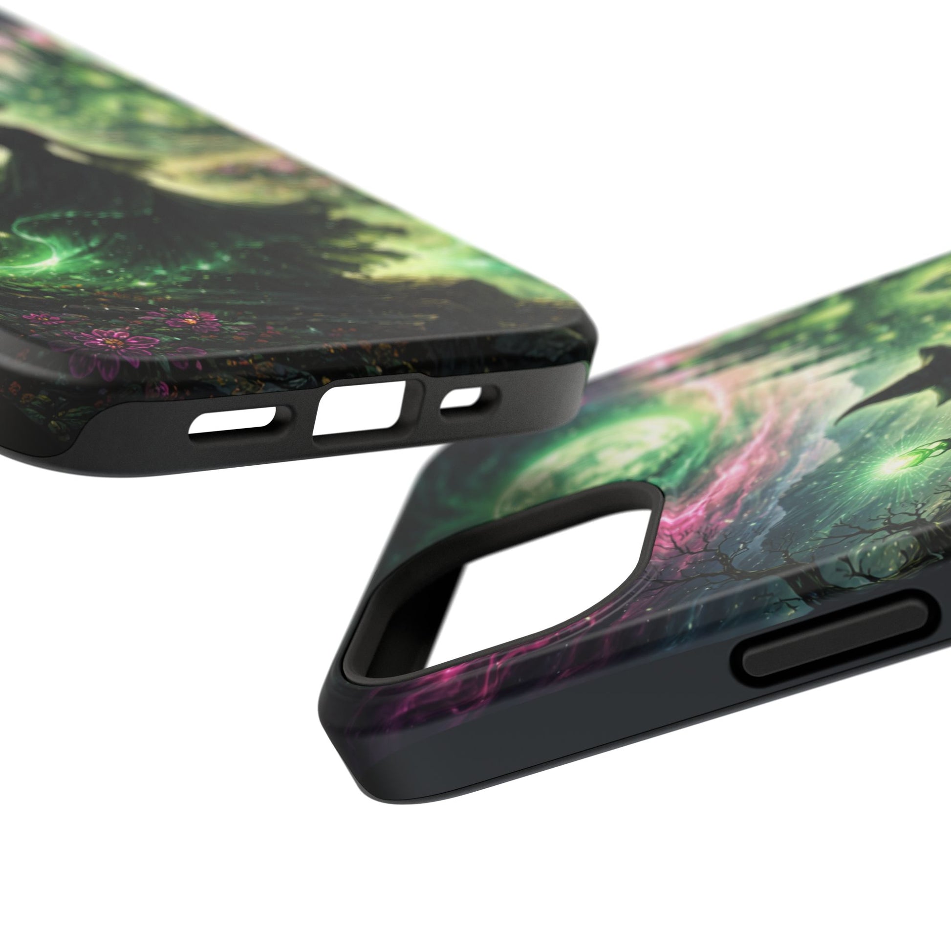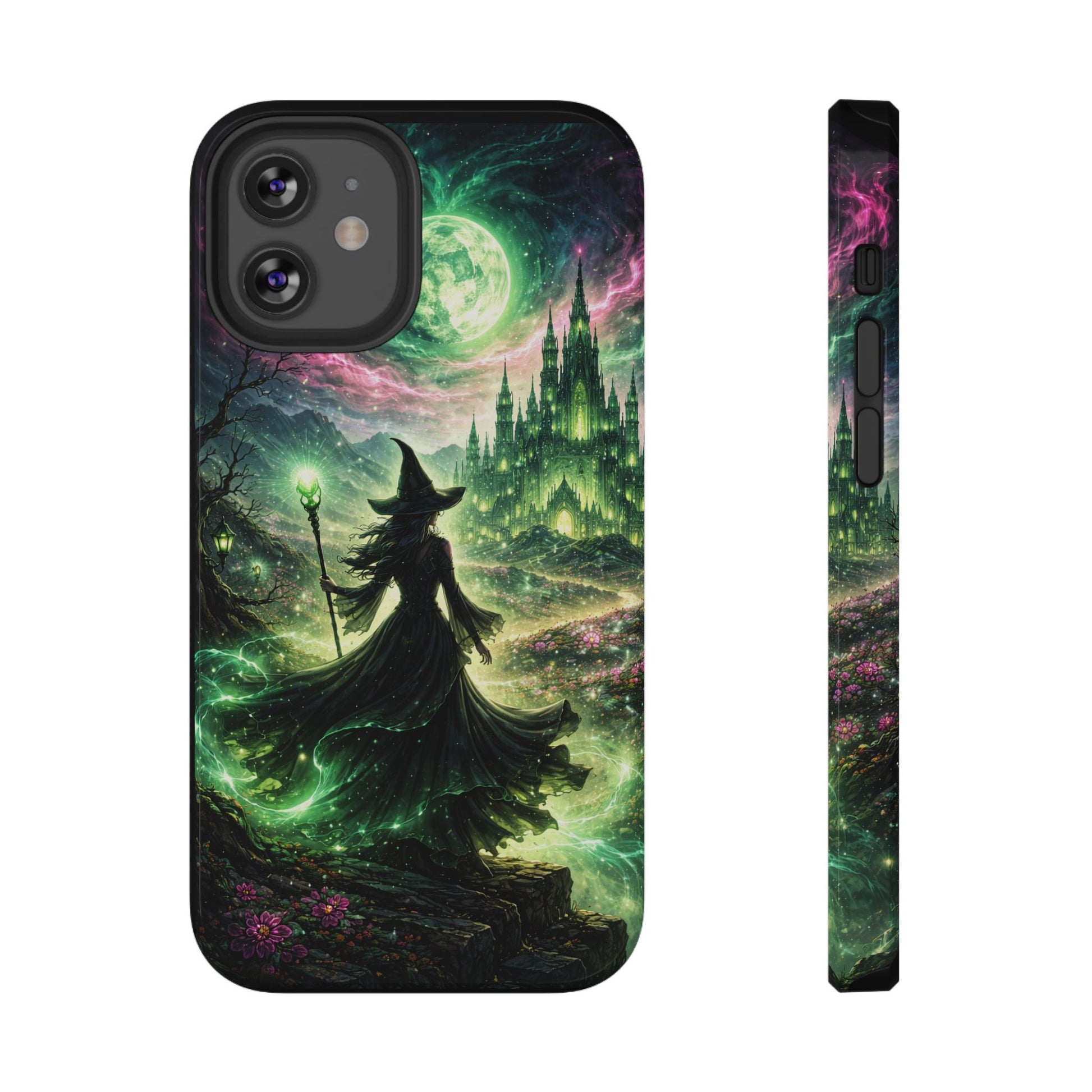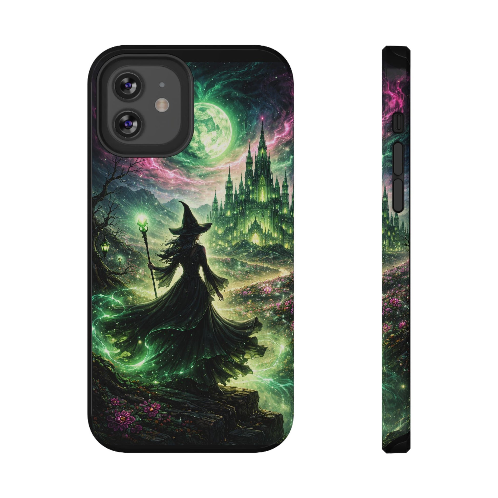 Hold a little bit of midnight magic in your hand. This impact-resistant phone case wraps your device in a swirling, witchy scene — moonlight, emerald spell trails, and a pair of mystic witches captured in jewel-toned detail. The print bleeds to the edges so the artwork feels continuous, while a snug black TPU inner layer cushions against shocks. Carry it on witch walks, forest nights, or while sketching tarot spreads at your favorite café. The glossy or matte finish options let you choose between a luminous, head-turning sheen or a softer, velvety look. Made to work with wireless charging and built for everyday life, it’s the kind of case that keeps your phone safe and your aesthetic loud.