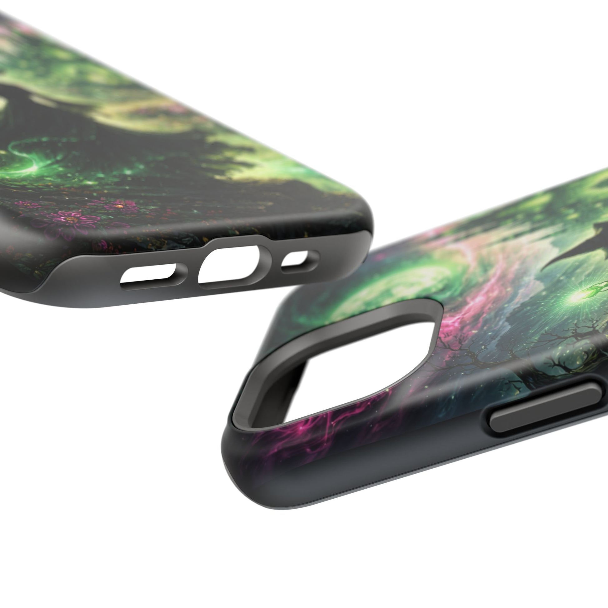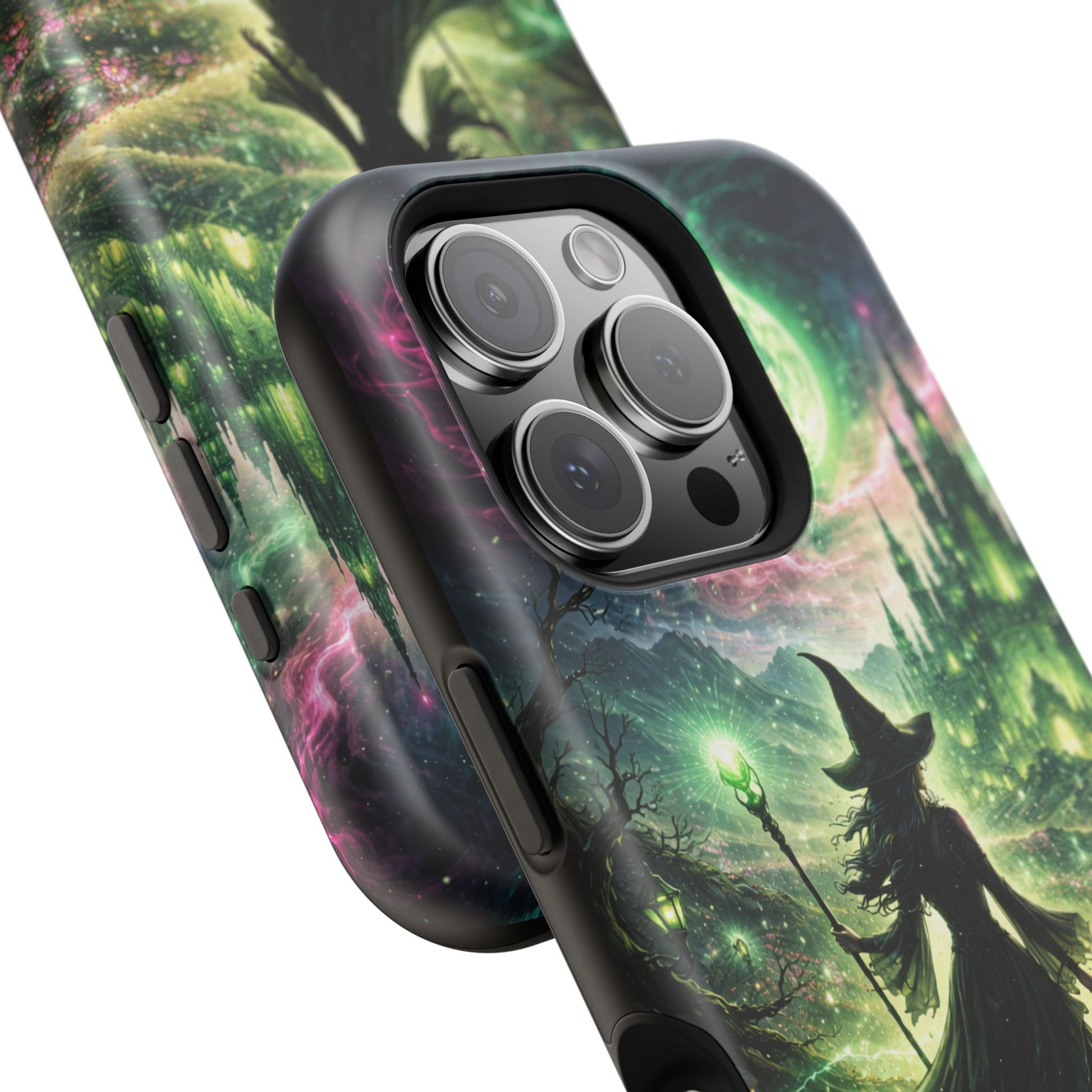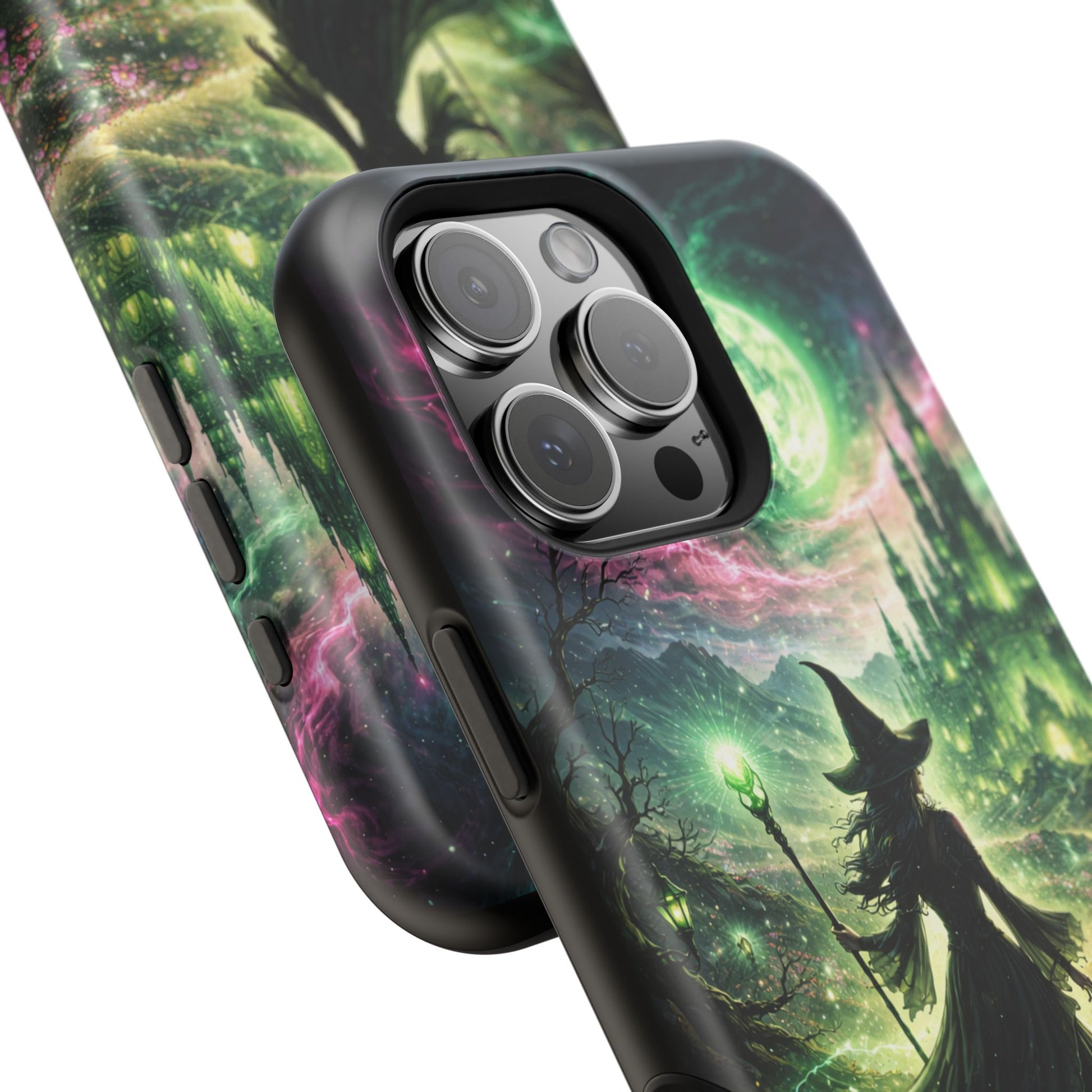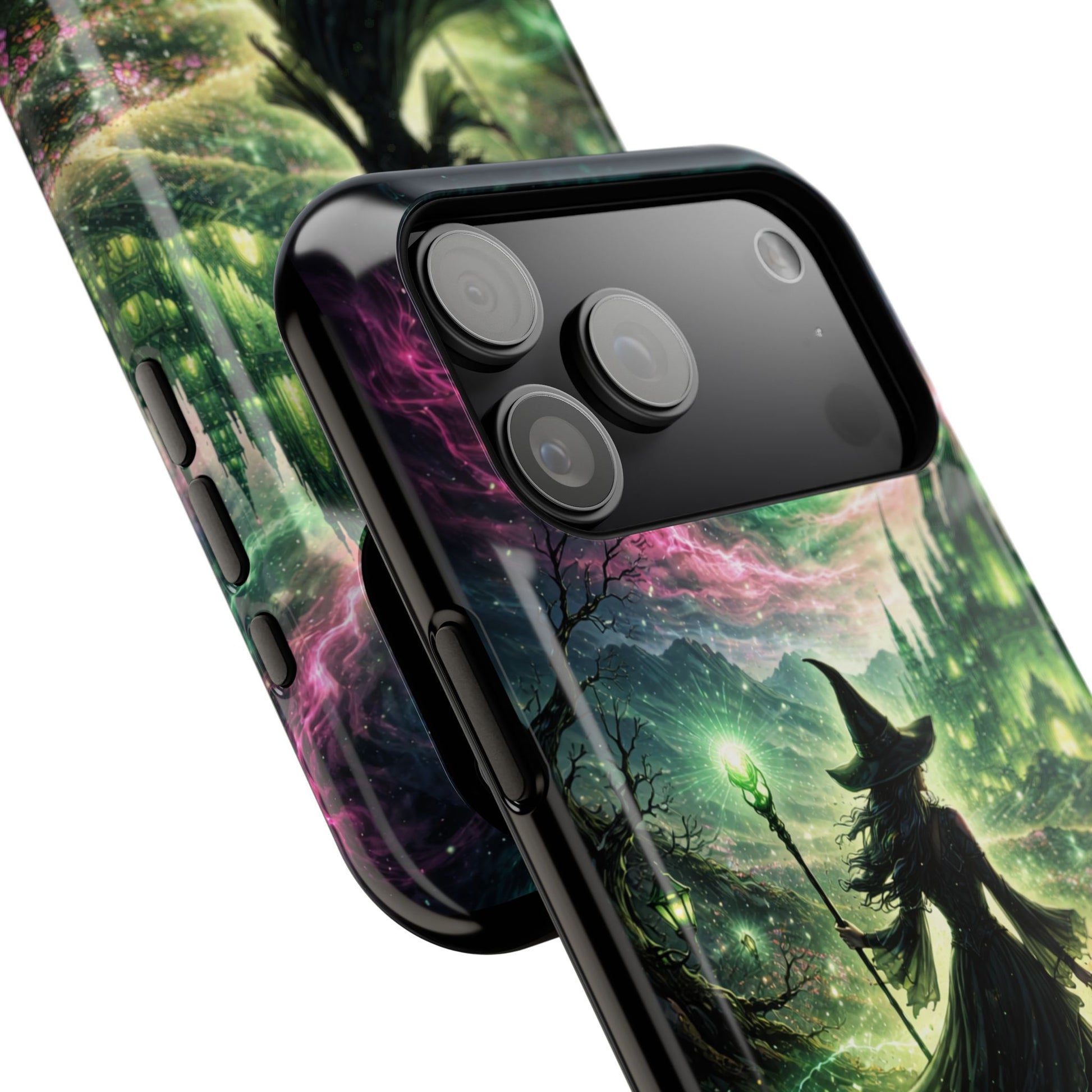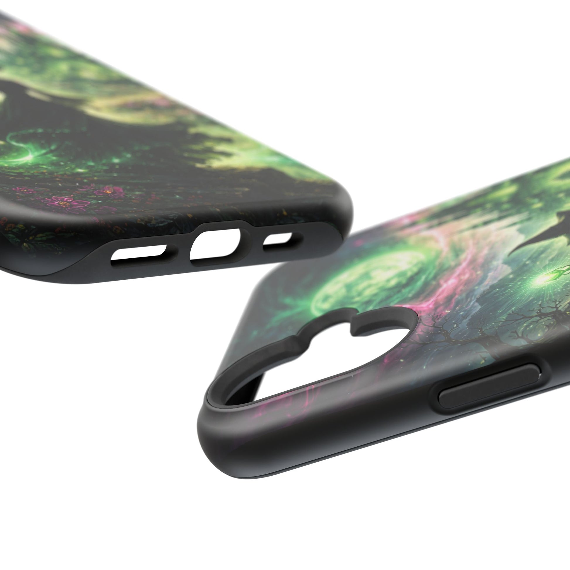 Hold a little bit of midnight magic in your hand. This impact-resistant phone case wraps your device in a swirling, witchy scene — moonlight, emerald spell trails, and a pair of mystic witches captured in jewel-toned detail. The print bleeds to the edges so the artwork feels continuous, while a snug black TPU inner layer cushions against shocks. Carry it on witch walks, forest nights, or while sketching tarot spreads at your favorite café. The glossy or matte finish options let you choose between a luminous, head-turning sheen or a softer, velvety look. Made to work with wireless charging and built for everyday life, it’s the kind of case that keeps your phone safe and your aesthetic loud.