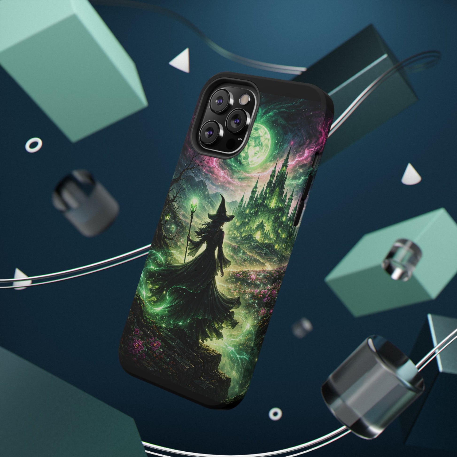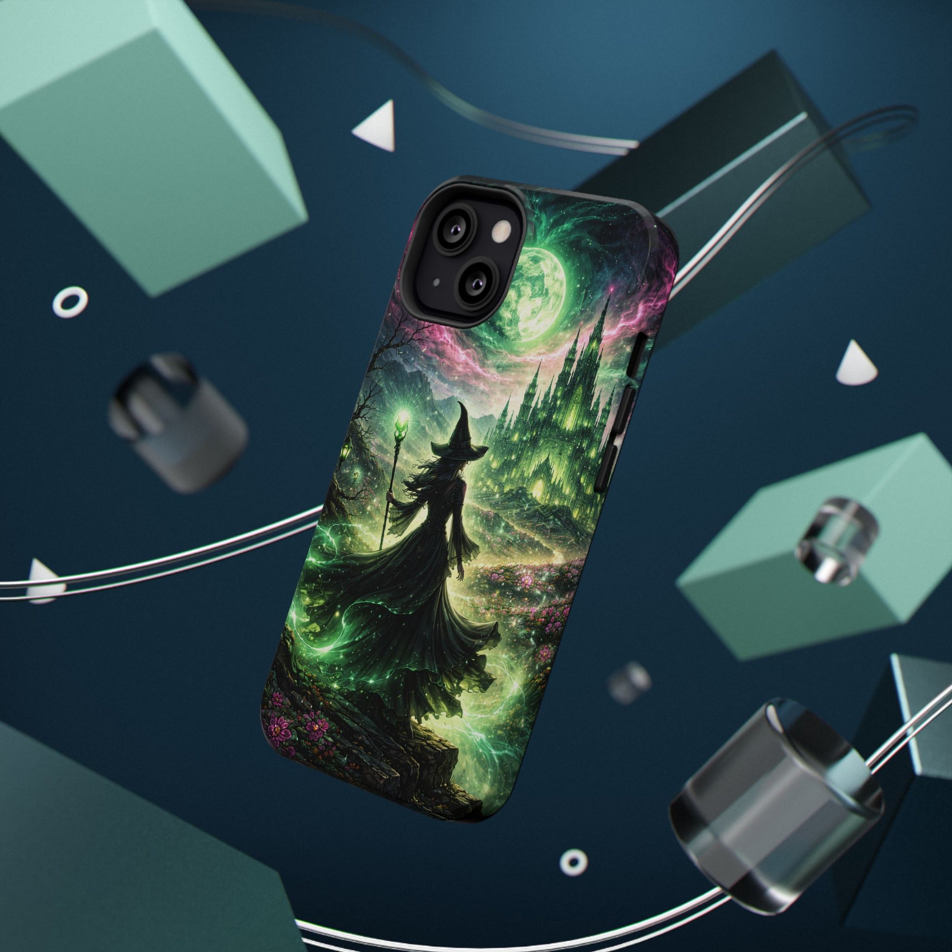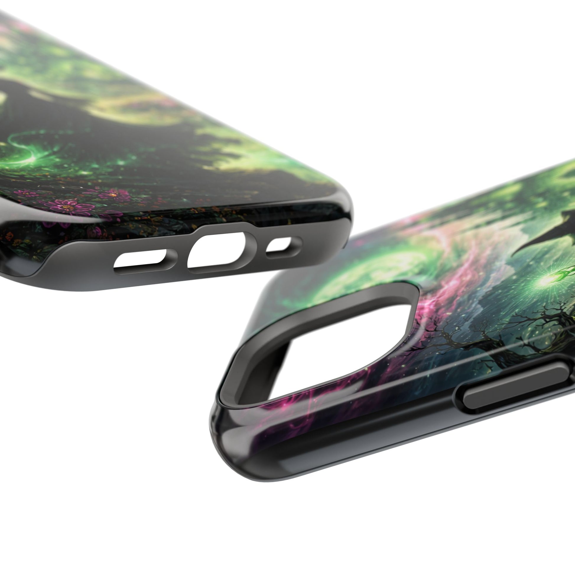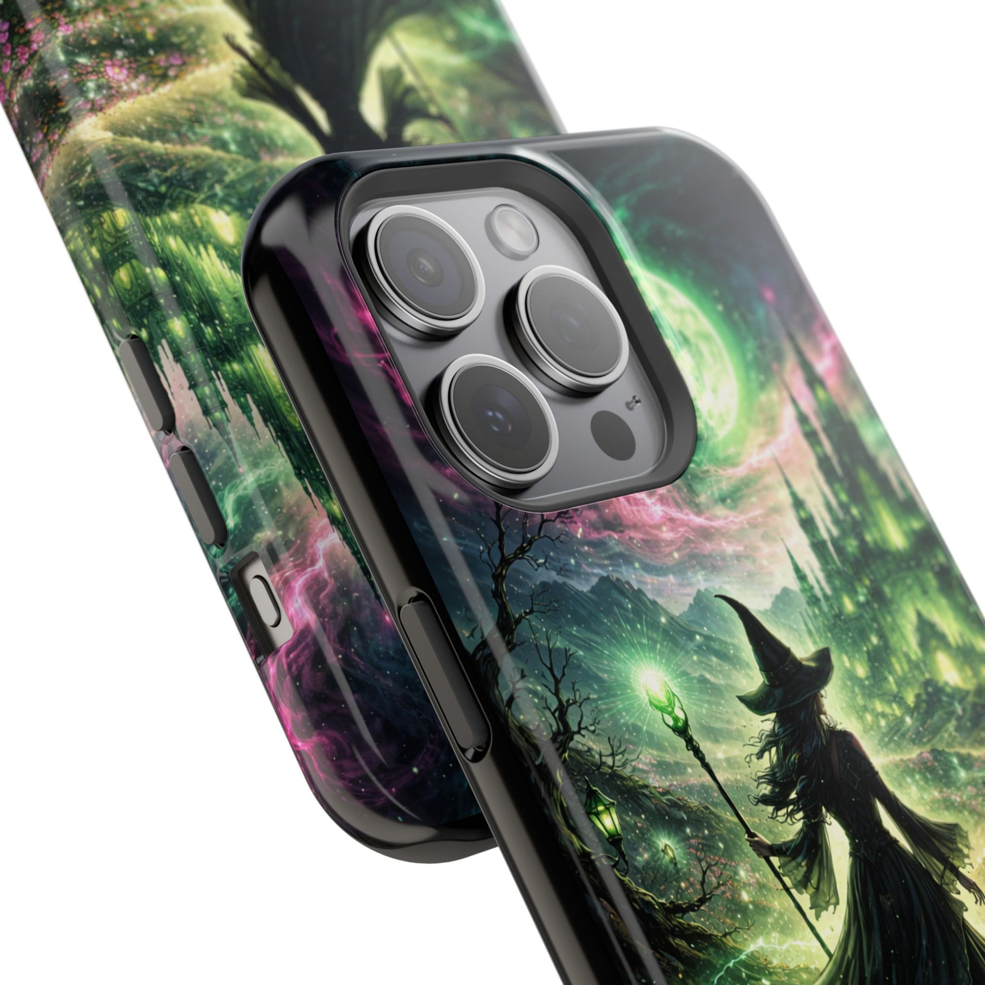 Hold a little bit of midnight magic in your hand. This impact-resistant phone case wraps your device in a swirling, witchy scene — moonlight, emerald spell trails, and a pair of mystic witches captured in jewel-toned detail. The print bleeds to the edges so the artwork feels continuous, while a snug black TPU inner layer cushions against shocks. Carry it on witch walks, forest nights, or while sketching tarot spreads at your favorite café. The glossy or matte finish options let you choose between a luminous, head-turning sheen or a softer, velvety look. Made to work with wireless charging and built for everyday life, it’s the kind of case that keeps your phone safe and your aesthetic loud.
