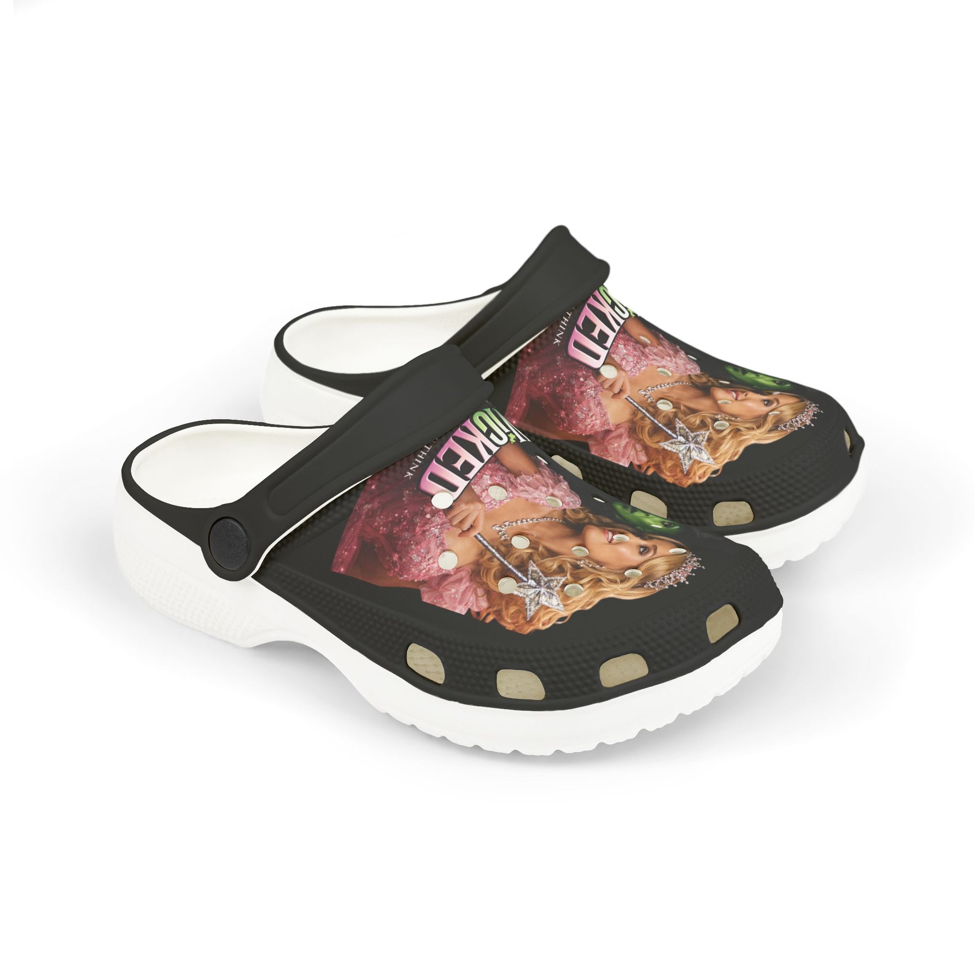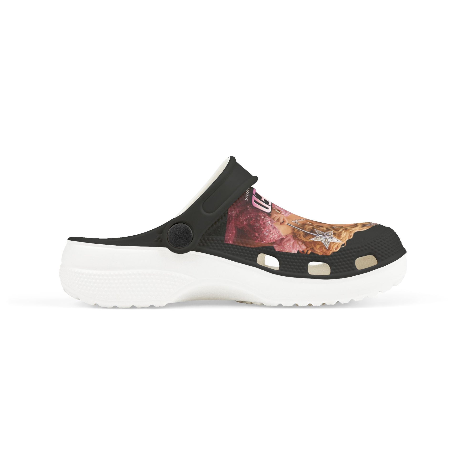 Lightweight, playful clogs designed for kids who love bold, theatrical style. These EVA foam clogs cushion small feet and follow natural curves for easy movement at playtime or while lounging at home. The printed upper shows a dramatic, storybook-inspired scene — a sparkling, pink-robed heroine beside a mysterious, green-faced companion — adding a touch of costume-magic to everyday wear. A back strap keeps the shoe secure during running and jumping, while interchangeable accessory charms let kids personalize their pair with shapes and characters. The color-contrasting insole and outsole (black or white) frame the print for a pop of contrast that stays fun from classroom to backyard.