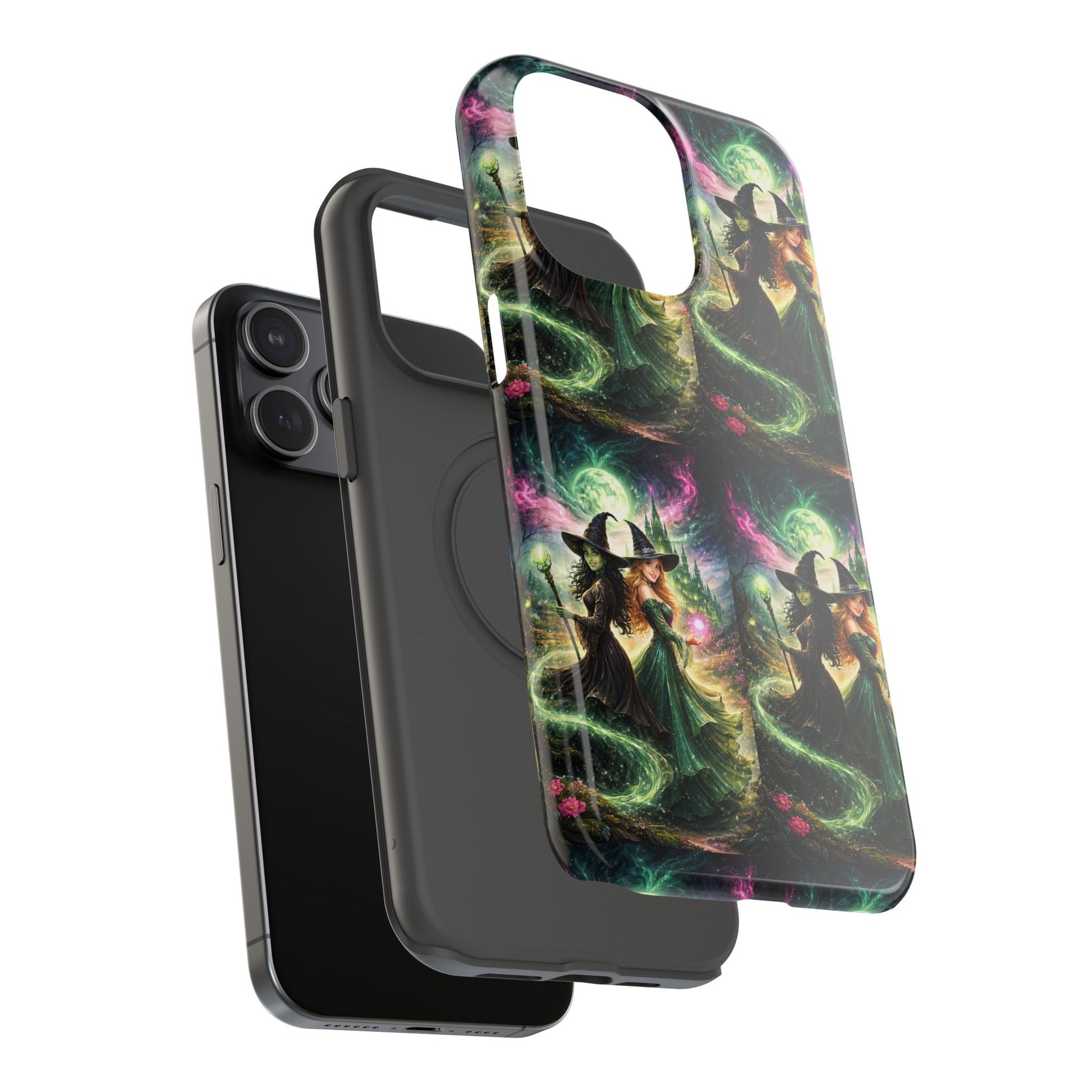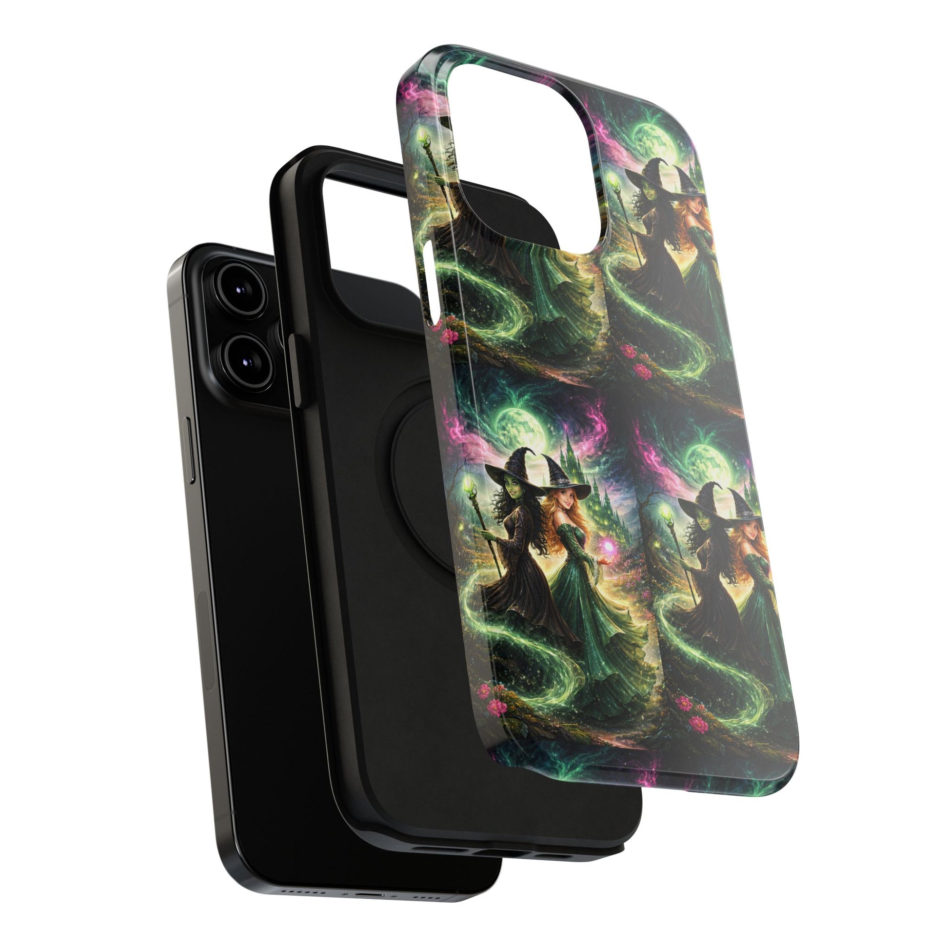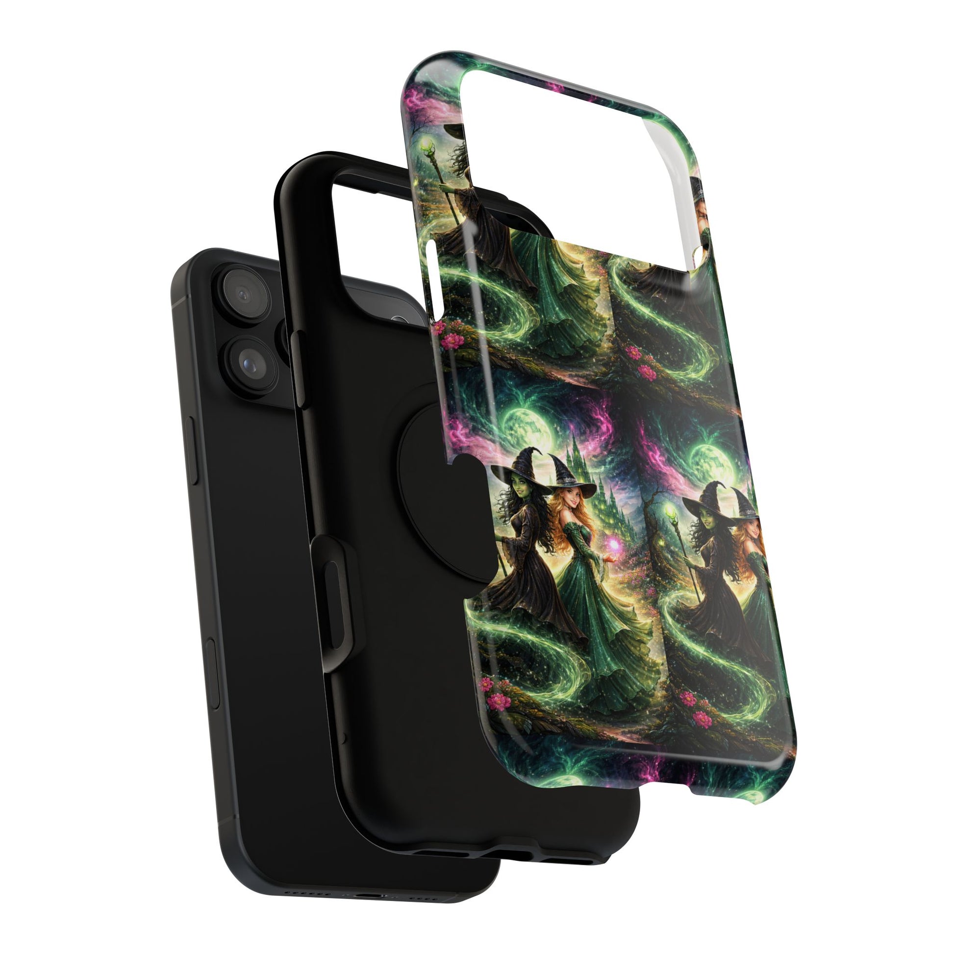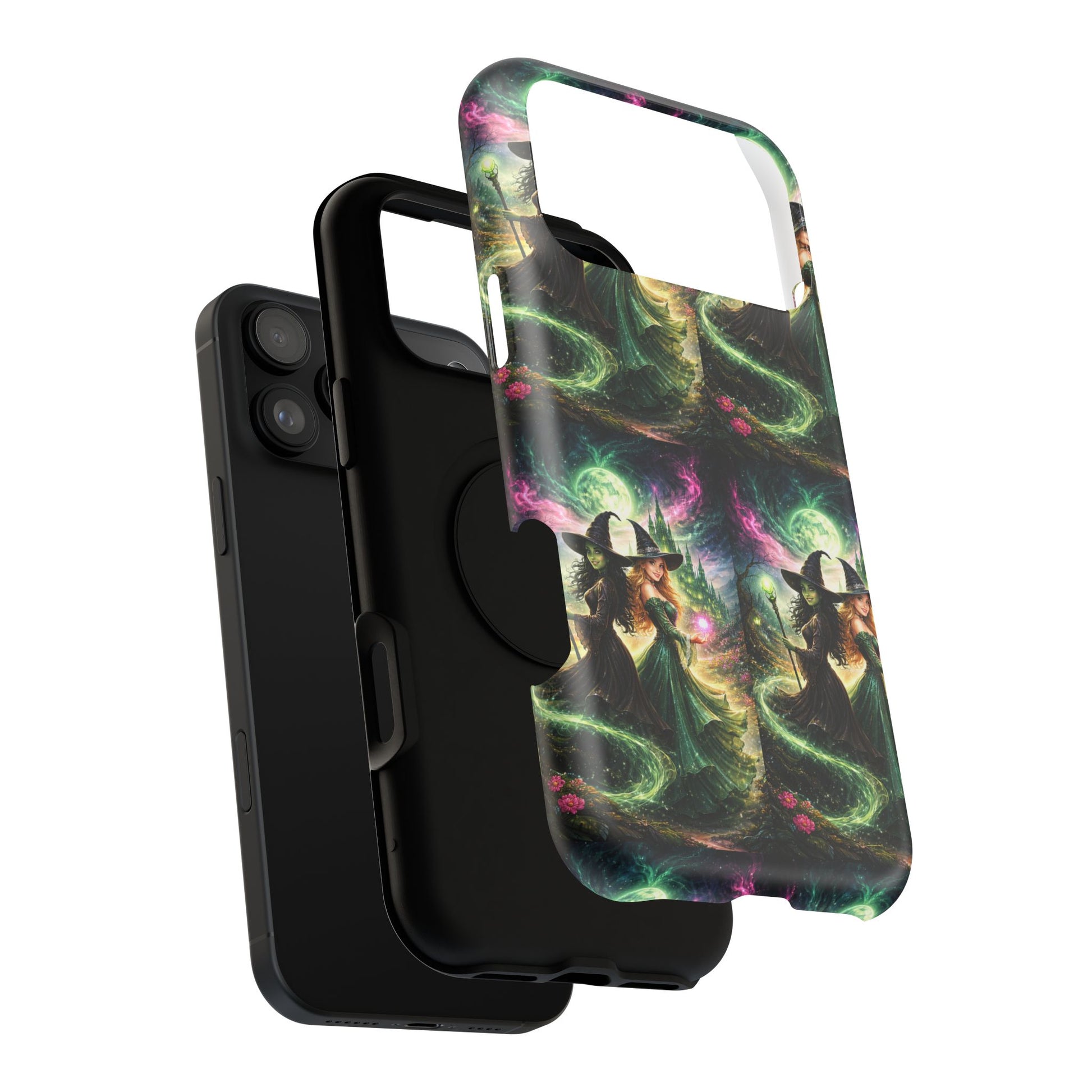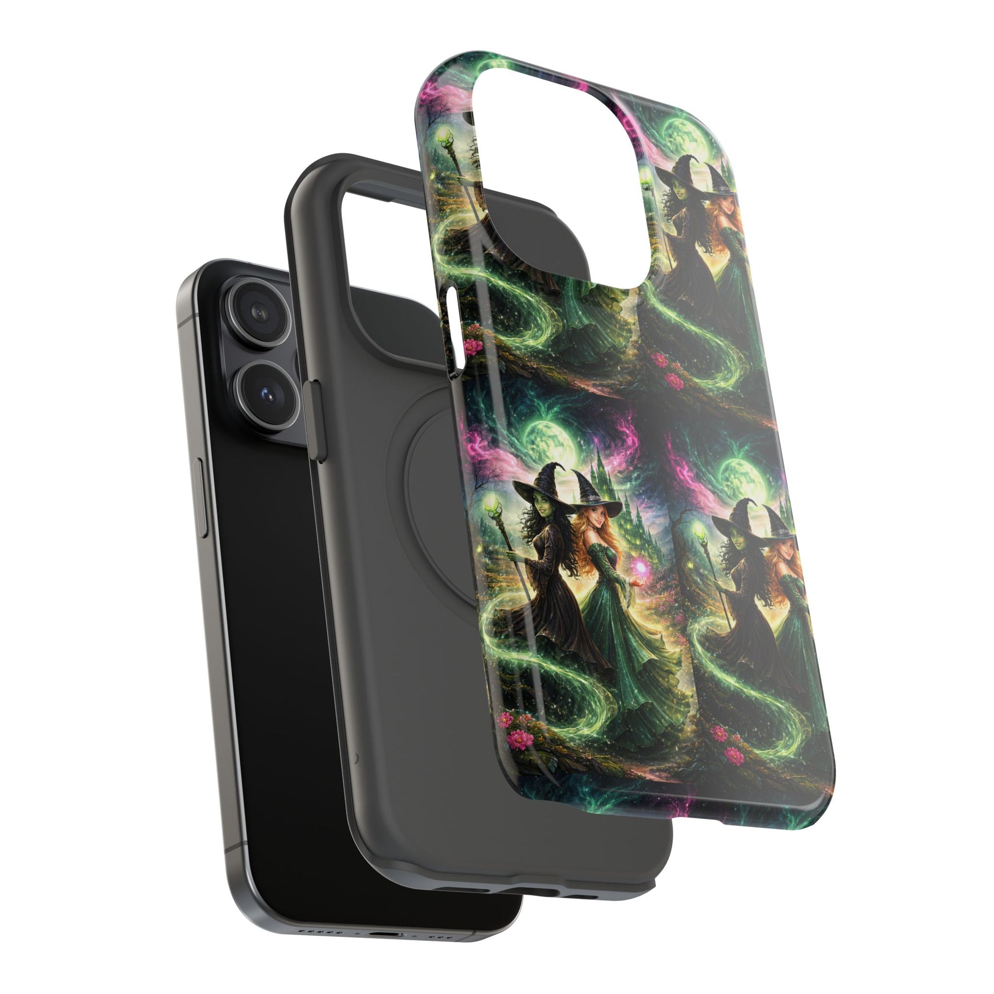 Hold a little bit of midnight magic in your hand. This impact-resistant phone case wraps your device in a swirling, witchy scene — moonlight, emerald spell trails, and a pair of mystic witches captured in jewel-toned detail. The print bleeds to the edges so the artwork feels continuous, while a snug black TPU inner layer cushions against shocks. Carry it on witch walks, forest nights, or while sketching tarot spreads at your favorite café. The glossy or matte finish options let you choose between a luminous, head-turning sheen or a softer, velvety look. Made to work with wireless charging and built for everyday life, it’s the kind of case that keeps your phone safe and your aesthetic loud.