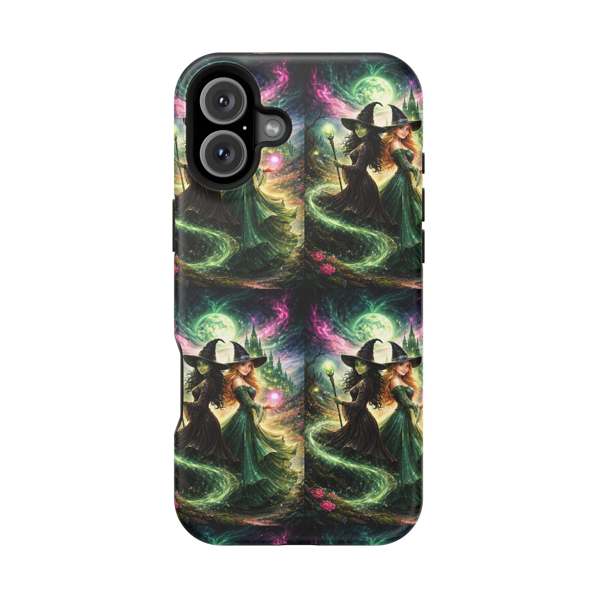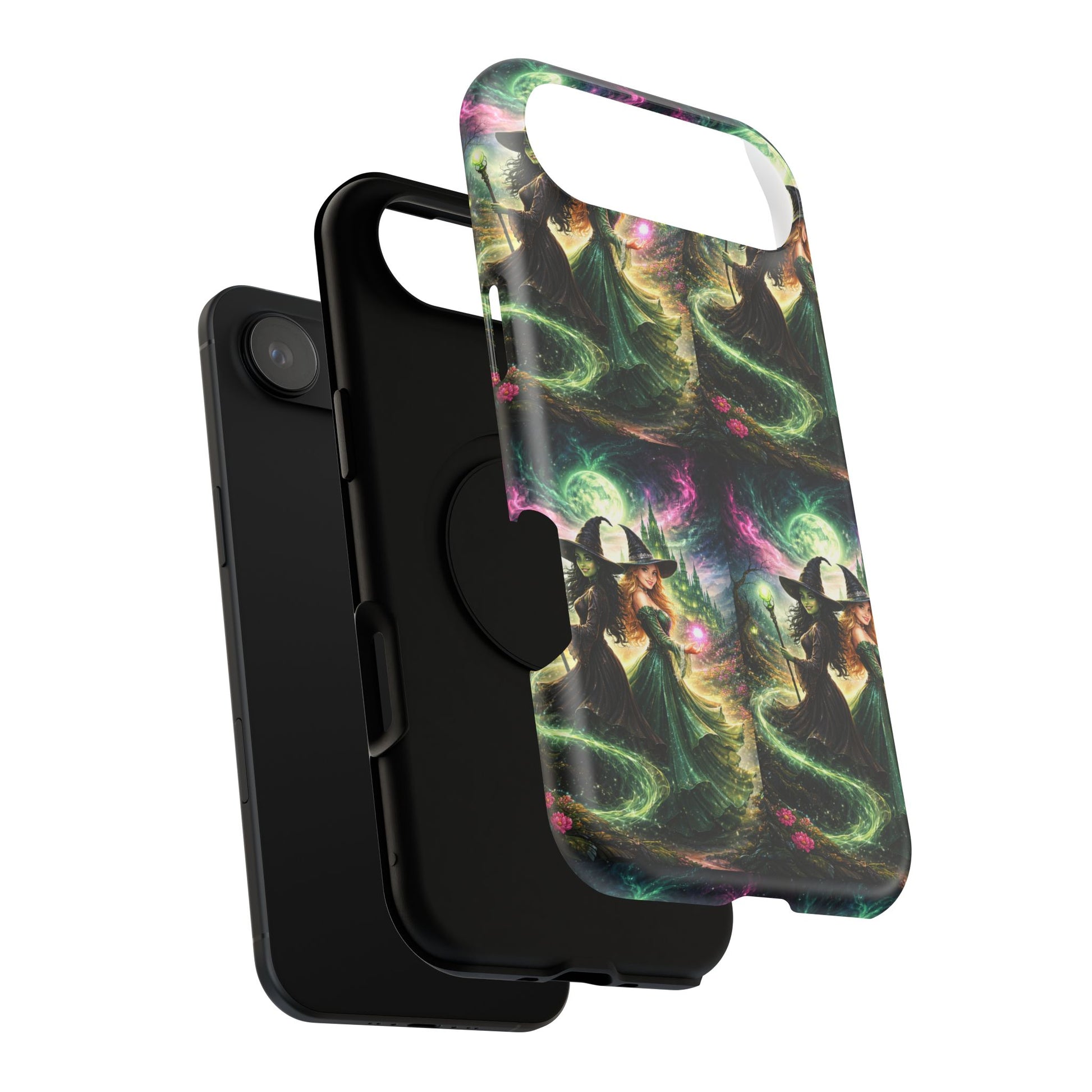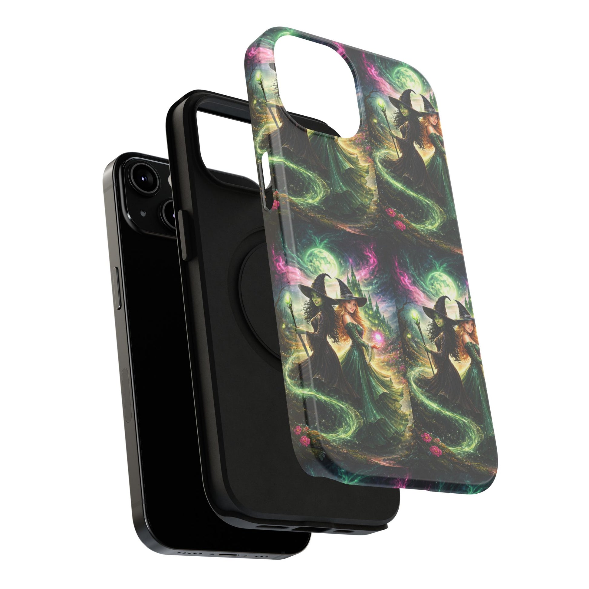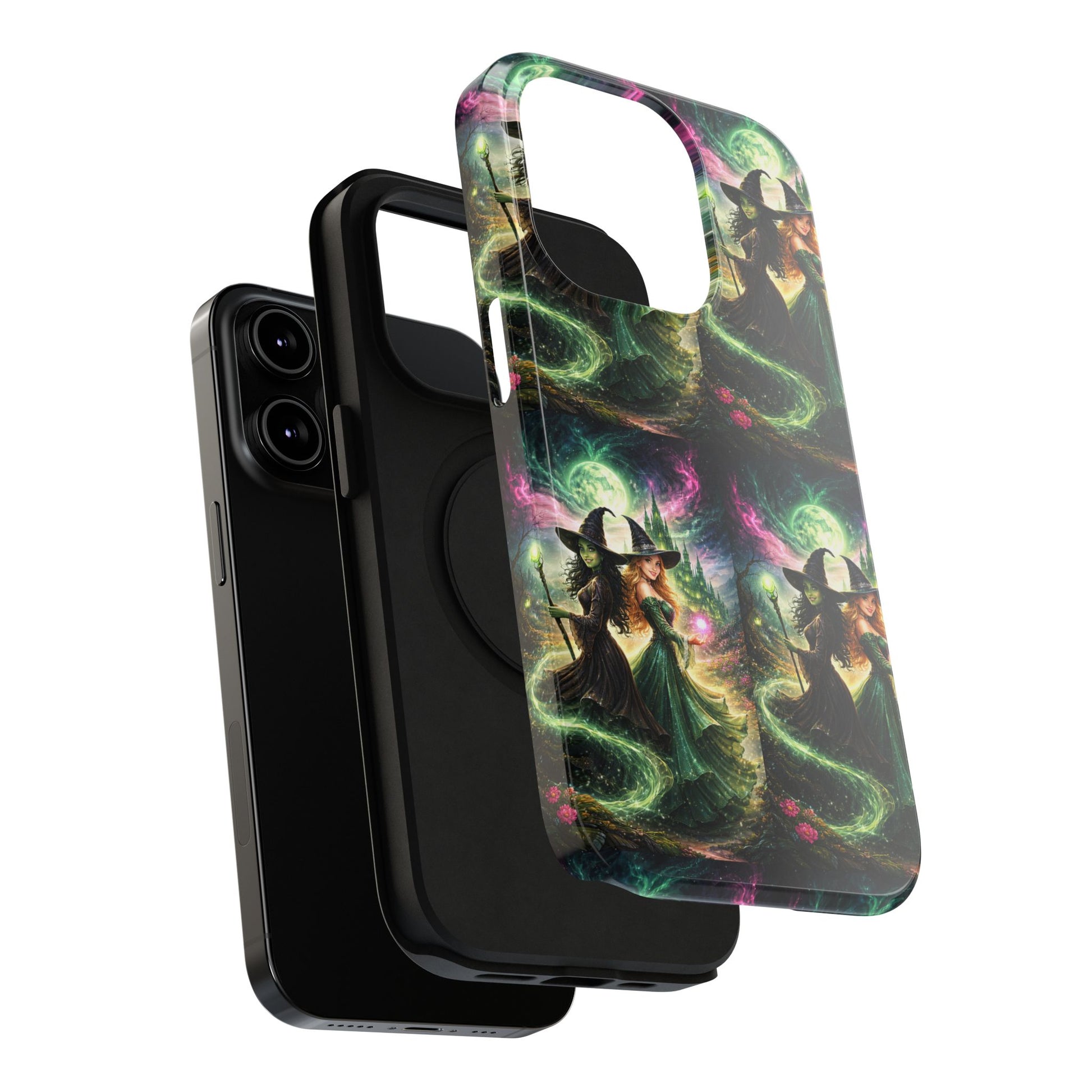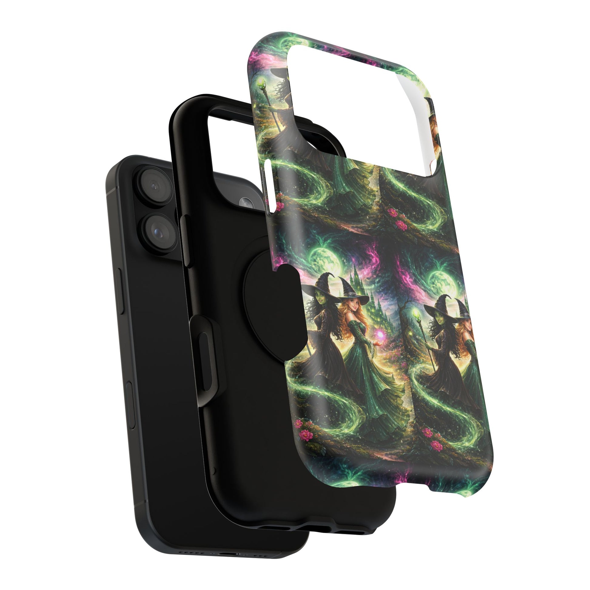 Hold a little bit of midnight magic in your hand. This impact-resistant phone case wraps your device in a swirling, witchy scene — moonlight, emerald spell trails, and a pair of mystic witches captured in jewel-toned detail. The print bleeds to the edges so the artwork feels continuous, while a snug black TPU inner layer cushions against shocks. Carry it on witch walks, forest nights, or while sketching tarot spreads at your favorite café. The glossy or matte finish options let you choose between a luminous, head-turning sheen or a softer, velvety look. Made to work with wireless charging and built for everyday life, it’s the kind of case that keeps your phone safe and your aesthetic loud.