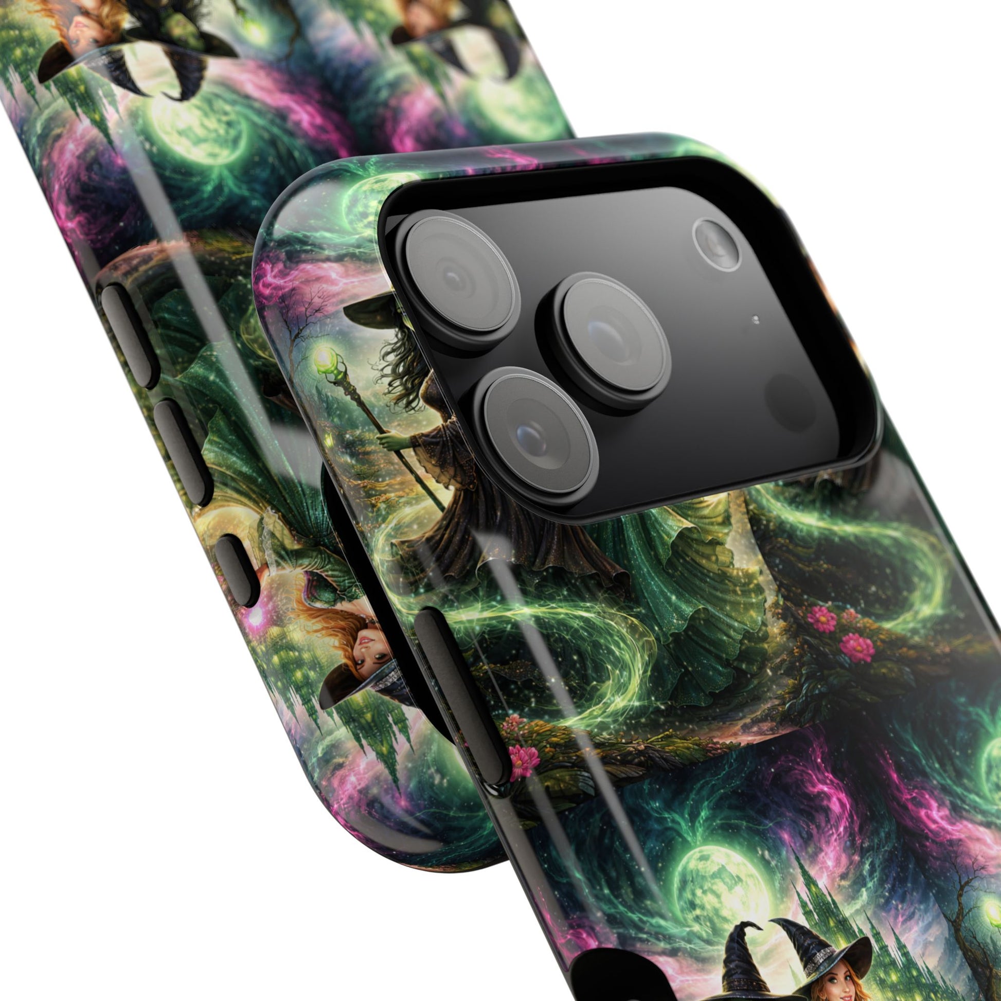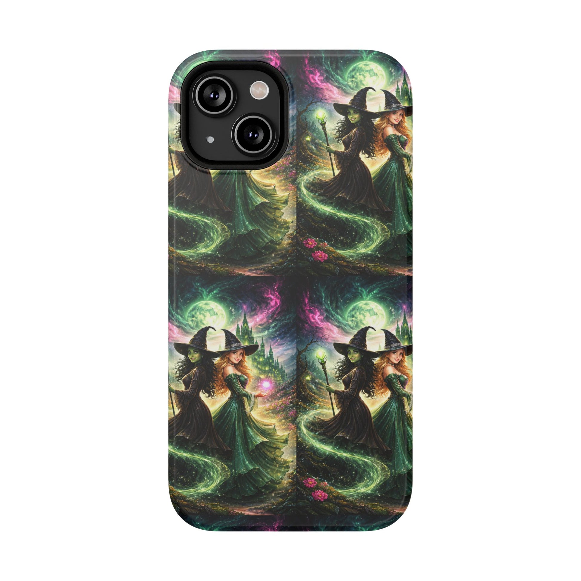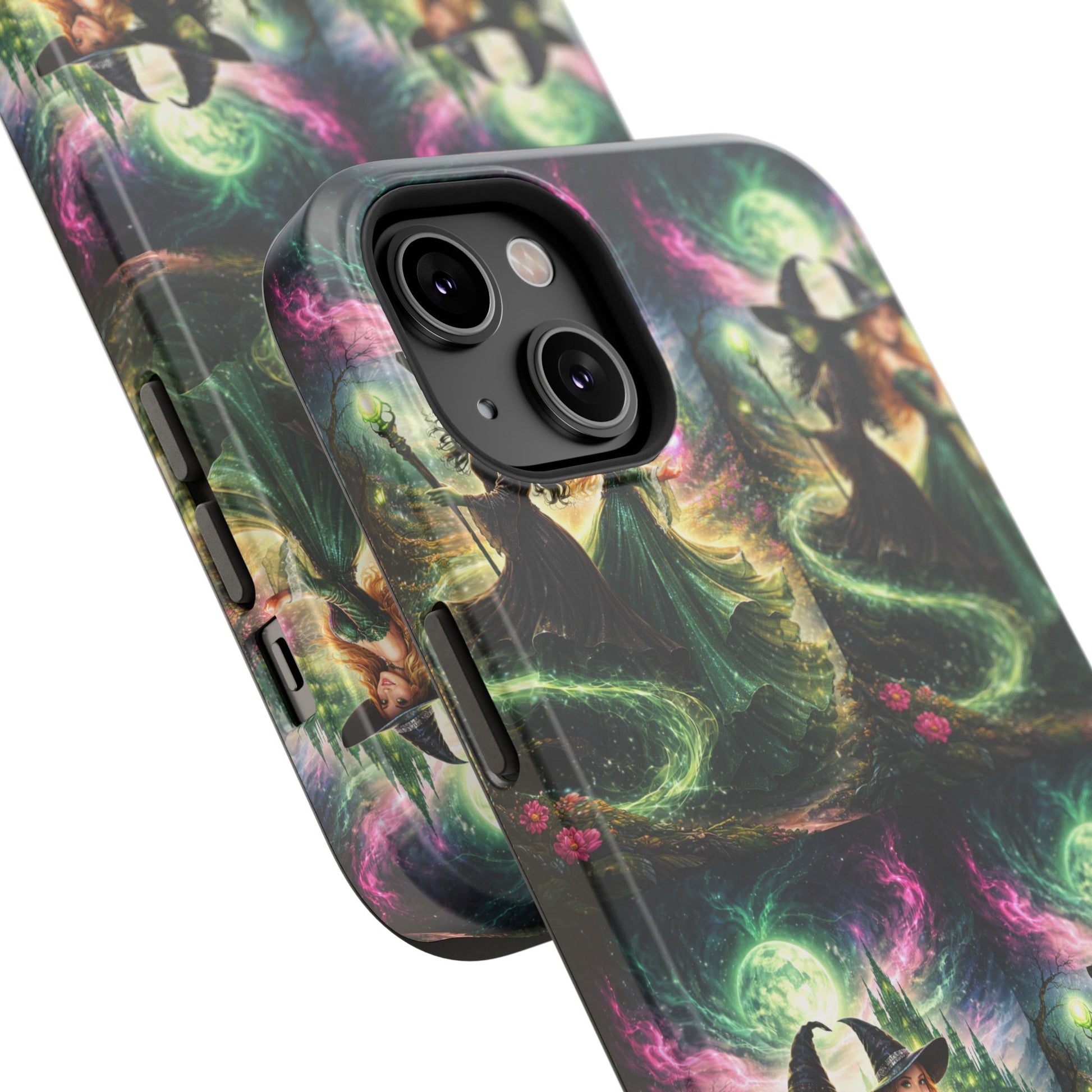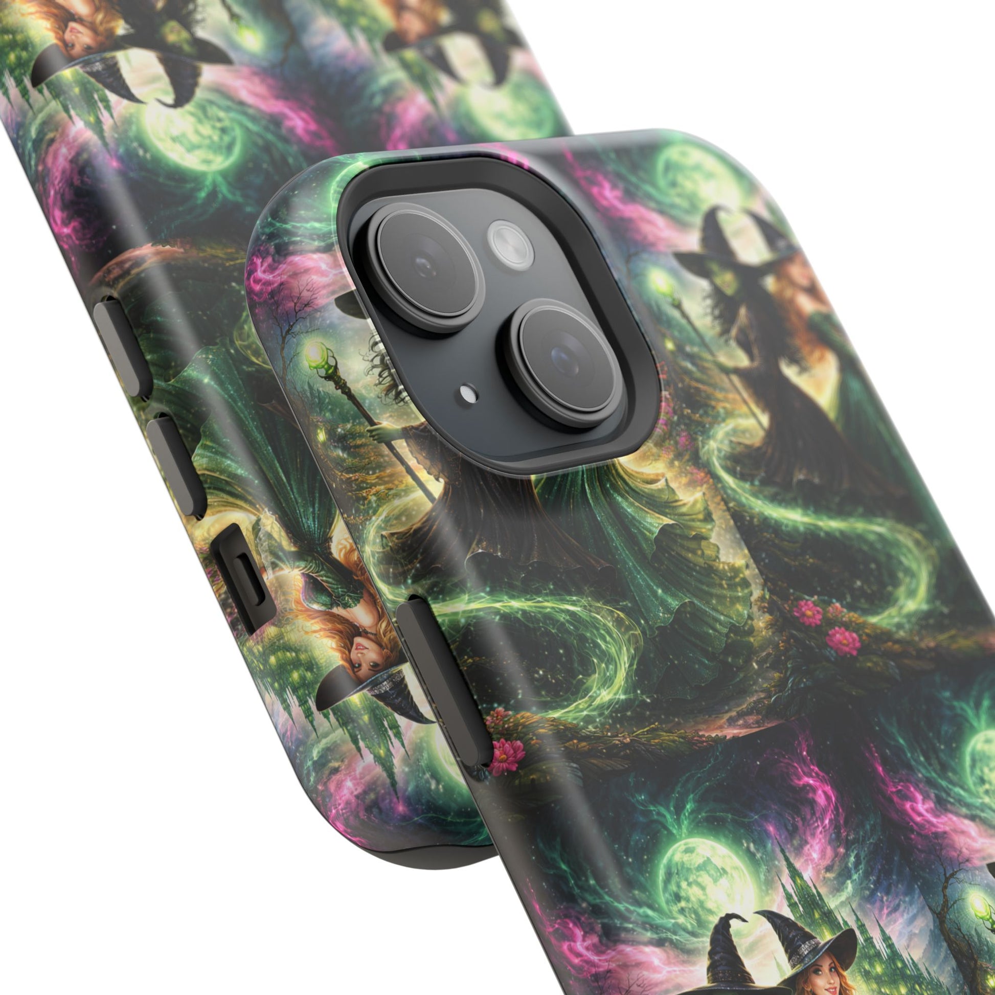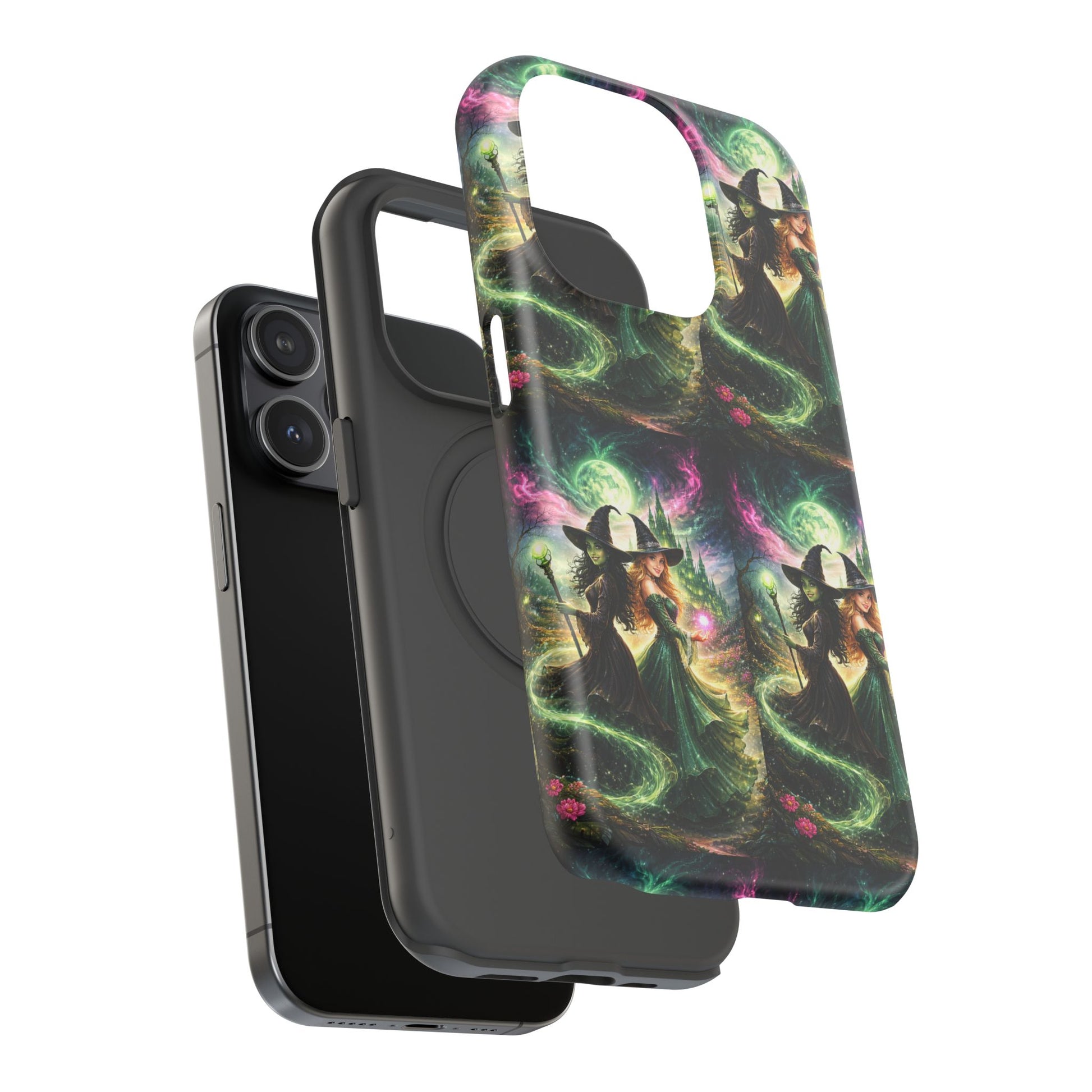 Hold a little bit of midnight magic in your hand. This impact-resistant phone case wraps your device in a swirling, witchy scene — moonlight, emerald spell trails, and a pair of mystic witches captured in jewel-toned detail. The print bleeds to the edges so the artwork feels continuous, while a snug black TPU inner layer cushions against shocks. Carry it on witch walks, forest nights, or while sketching tarot spreads at your favorite café. The glossy or matte finish options let you choose between a luminous, head-turning sheen or a softer, velvety look. Made to work with wireless charging and built for everyday life, it’s the kind of case that keeps your phone safe and your aesthetic loud.