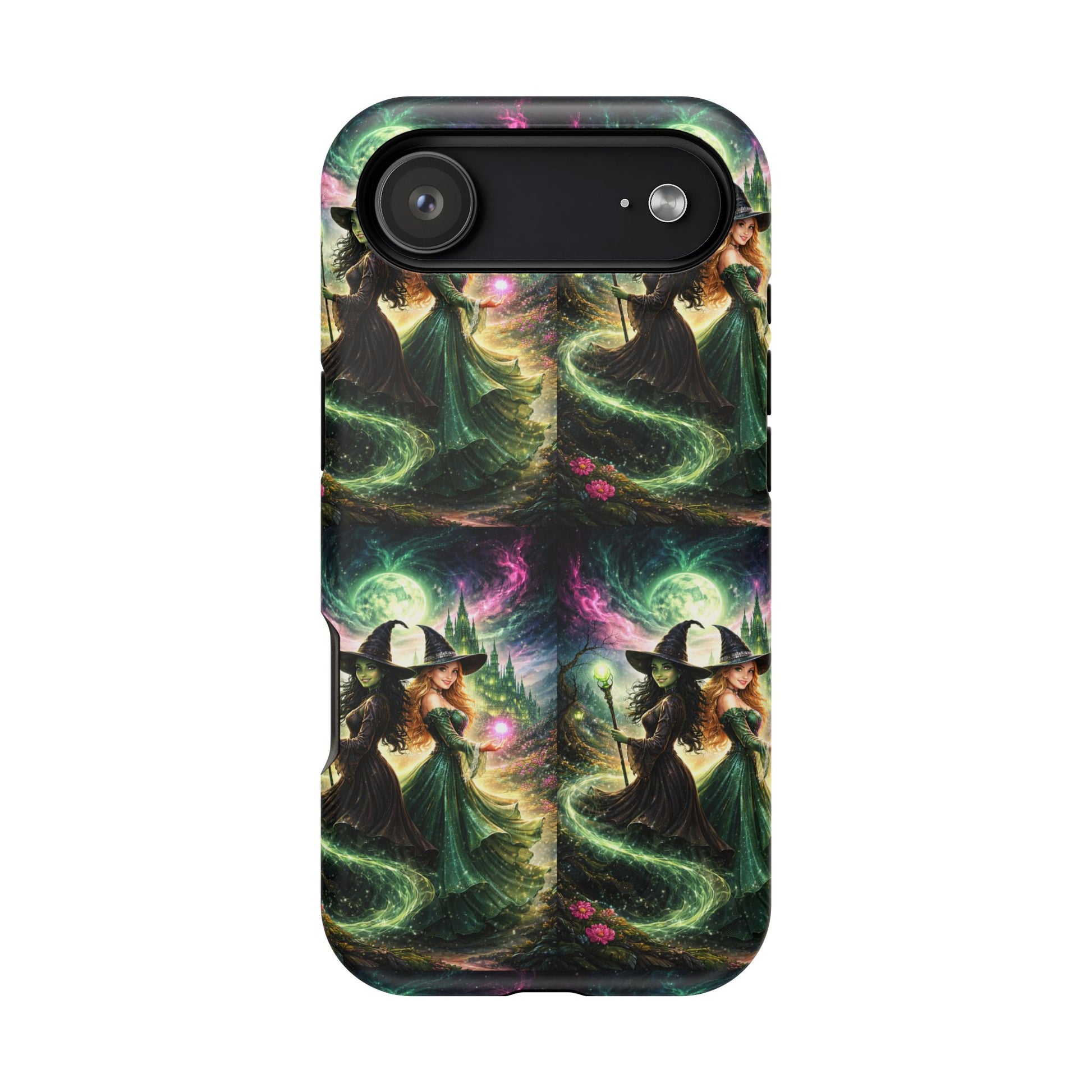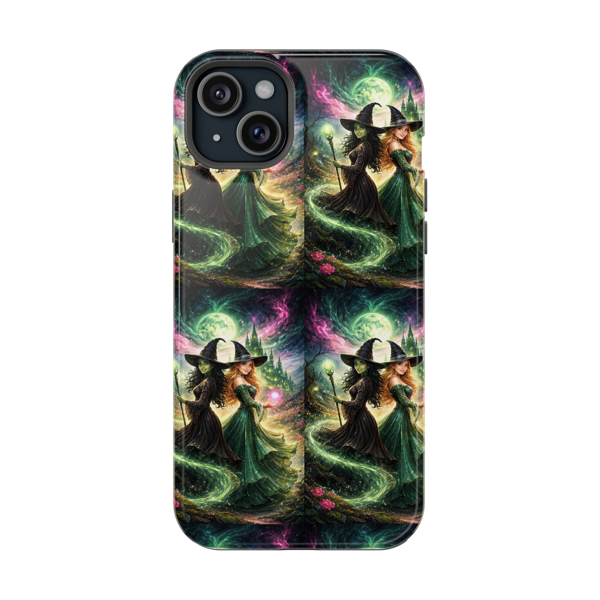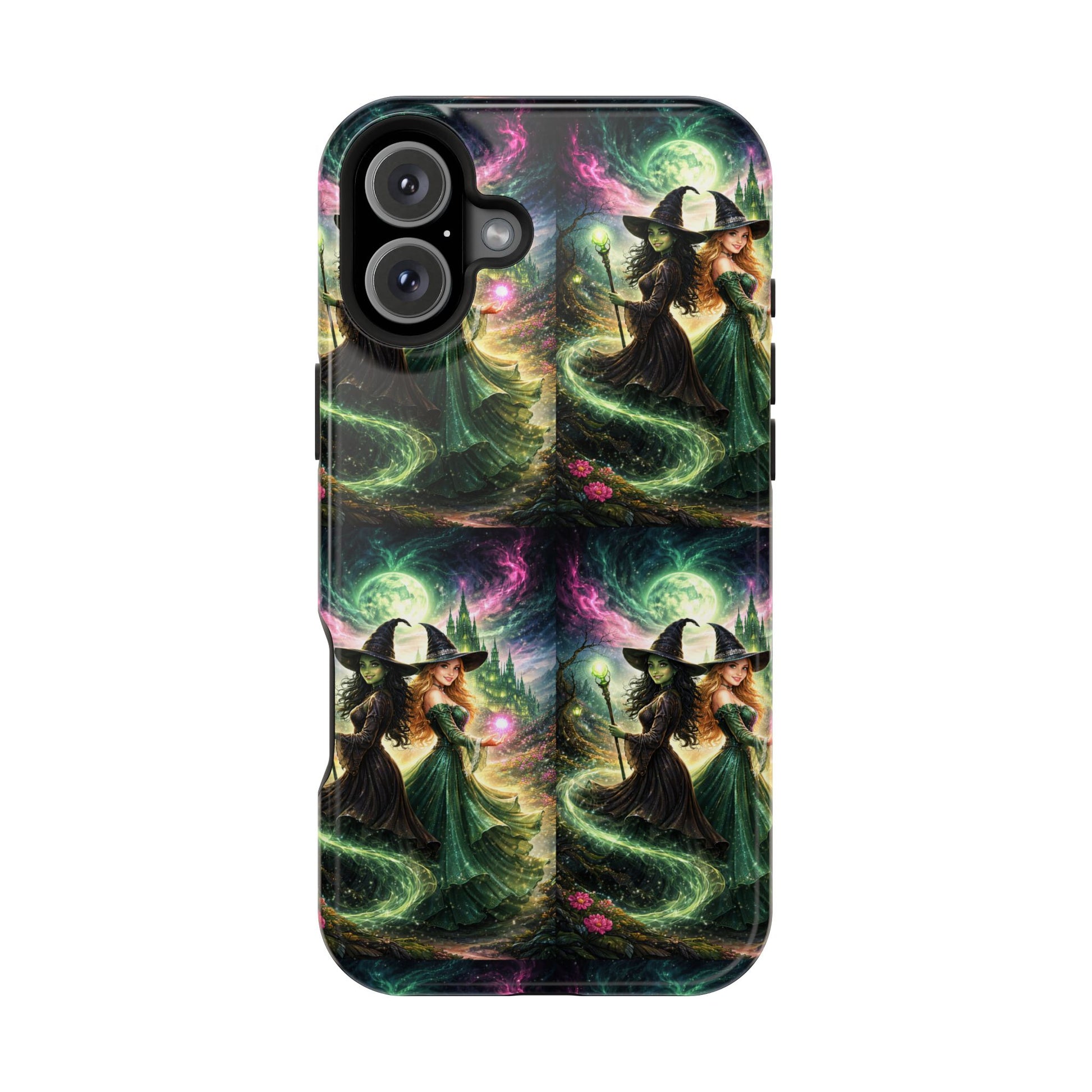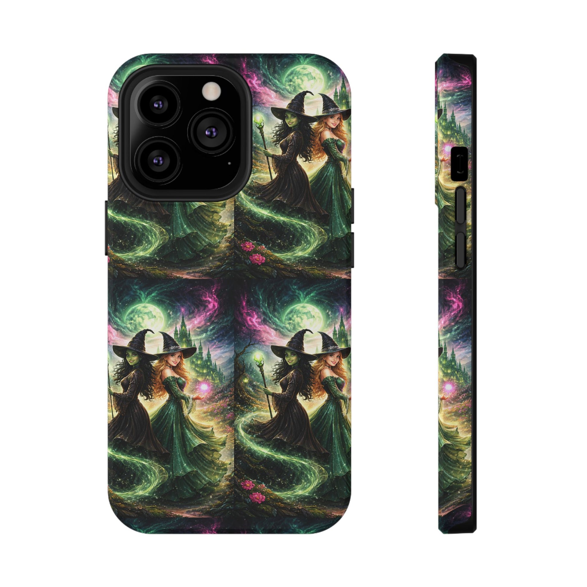 Hold a little bit of midnight magic in your hand. This impact-resistant phone case wraps your device in a swirling, witchy scene — moonlight, emerald spell trails, and a pair of mystic witches captured in jewel-toned detail. The print bleeds to the edges so the artwork feels continuous, while a snug black TPU inner layer cushions against shocks. Carry it on witch walks, forest nights, or while sketching tarot spreads at your favorite café. The glossy or matte finish options let you choose between a luminous, head-turning sheen or a softer, velvety look. Made to work with wireless charging and built for everyday life, it’s the kind of case that keeps your phone safe and your aesthetic loud.