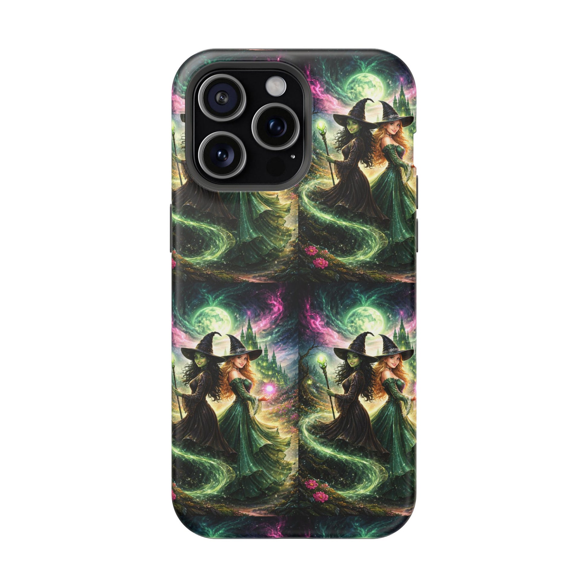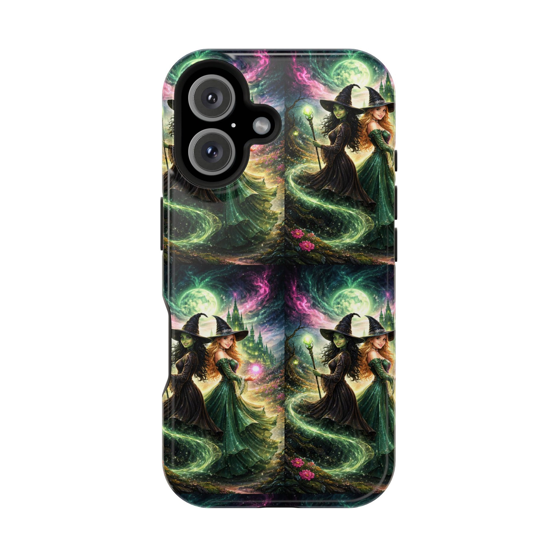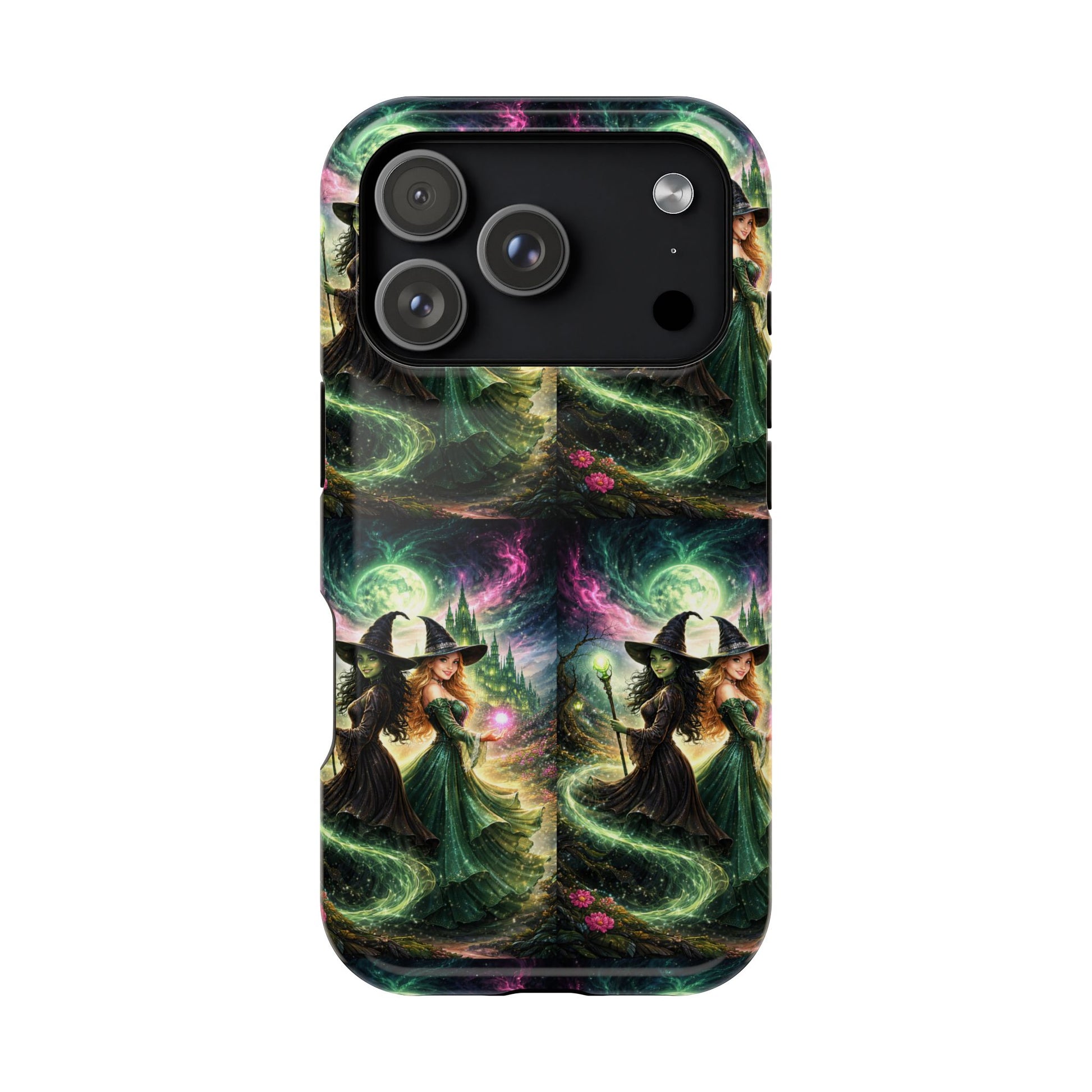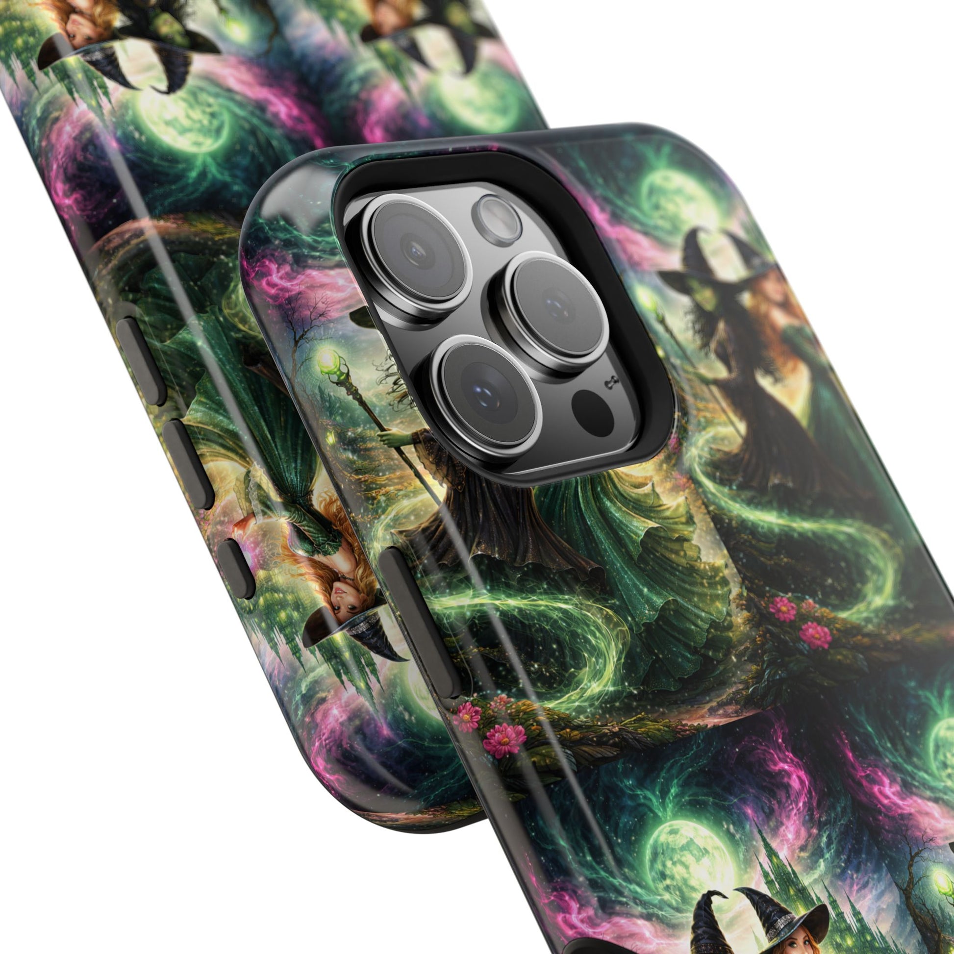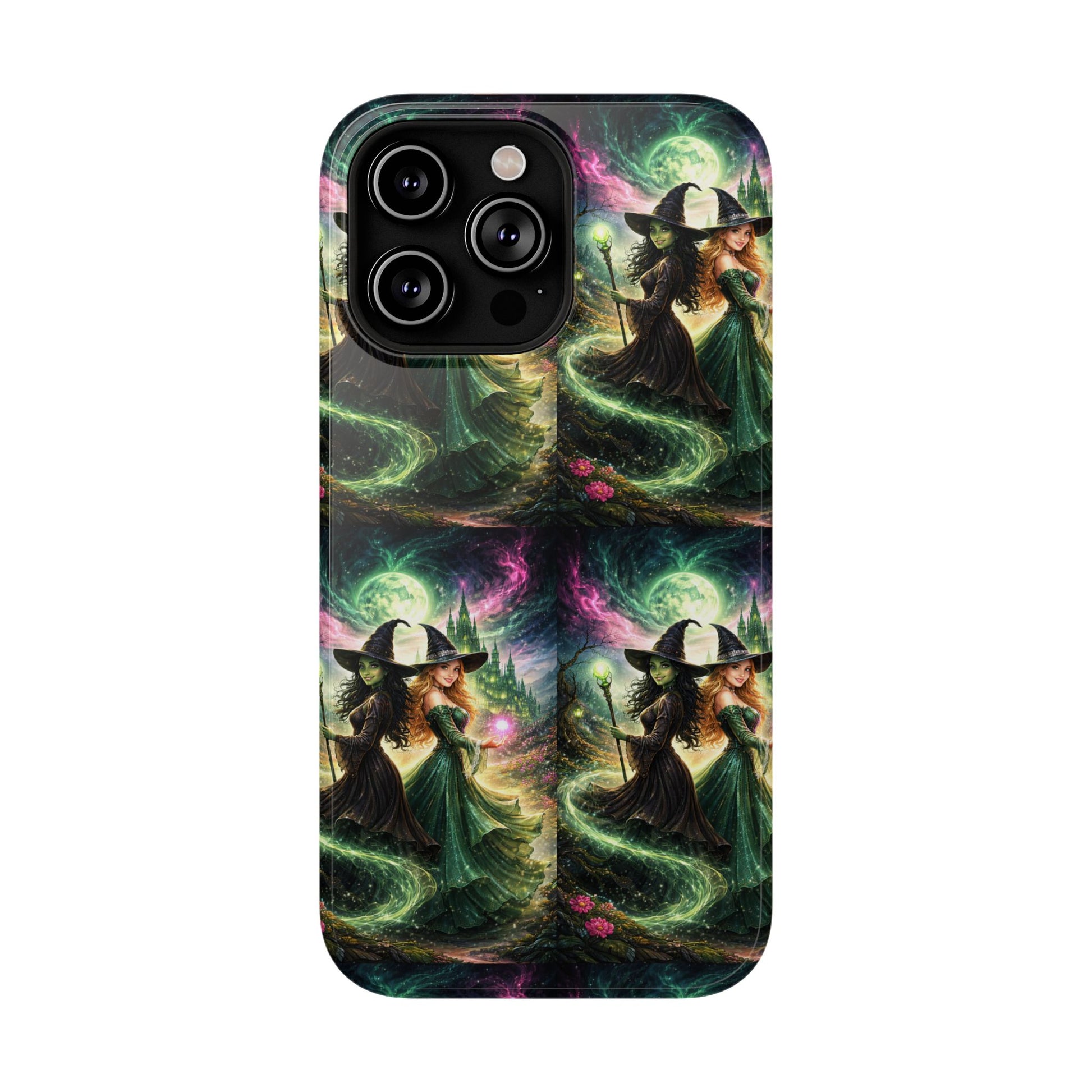 Hold a little bit of midnight magic in your hand. This impact-resistant phone case wraps your device in a swirling, witchy scene — moonlight, emerald spell trails, and a pair of mystic witches captured in jewel-toned detail. The print bleeds to the edges so the artwork feels continuous, while a snug black TPU inner layer cushions against shocks. Carry it on witch walks, forest nights, or while sketching tarot spreads at your favorite café. The glossy or matte finish options let you choose between a luminous, head-turning sheen or a softer, velvety look. Made to work with wireless charging and built for everyday life, it’s the kind of case that keeps your phone safe and your aesthetic loud.