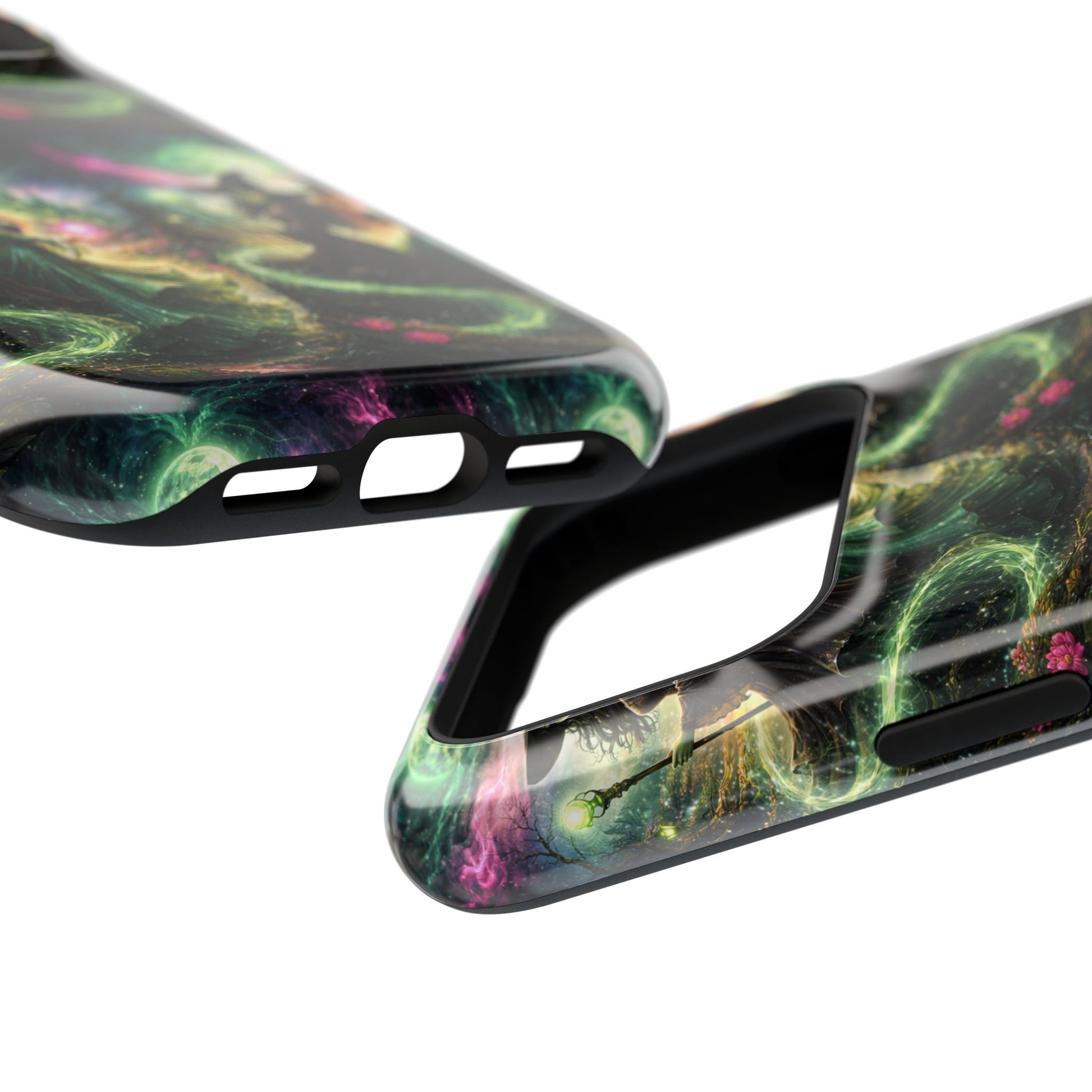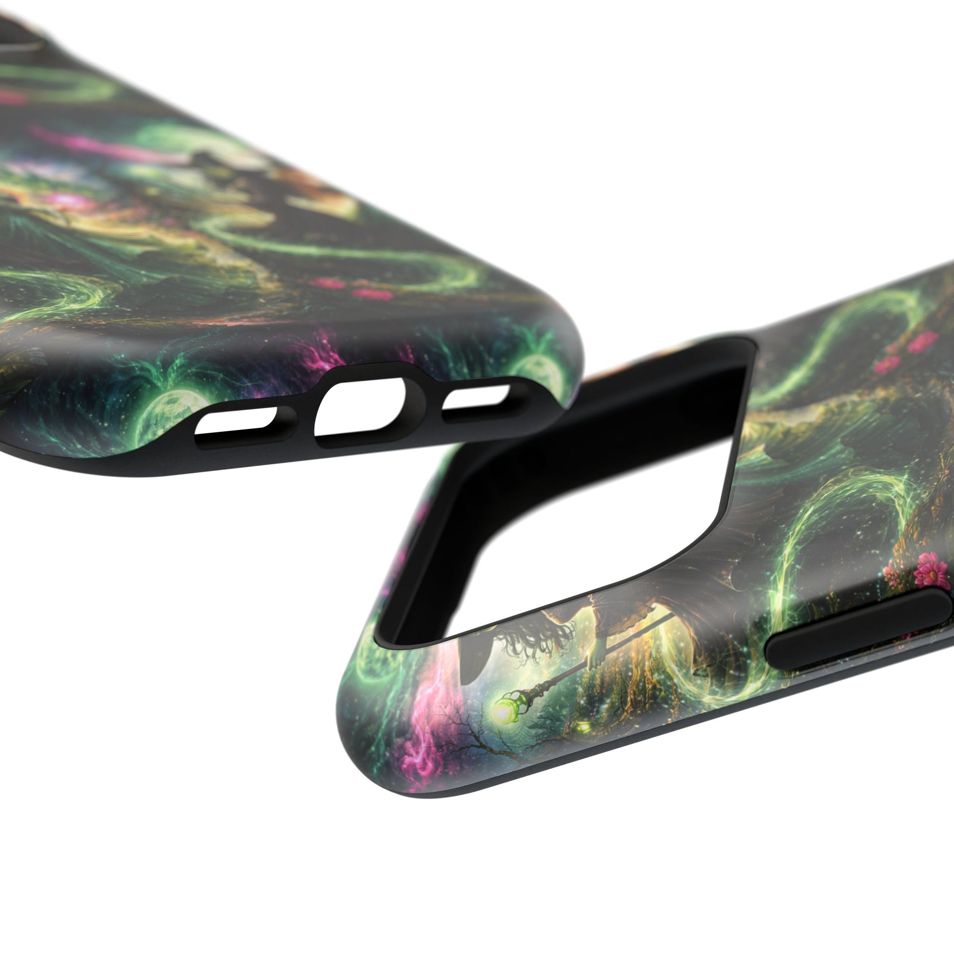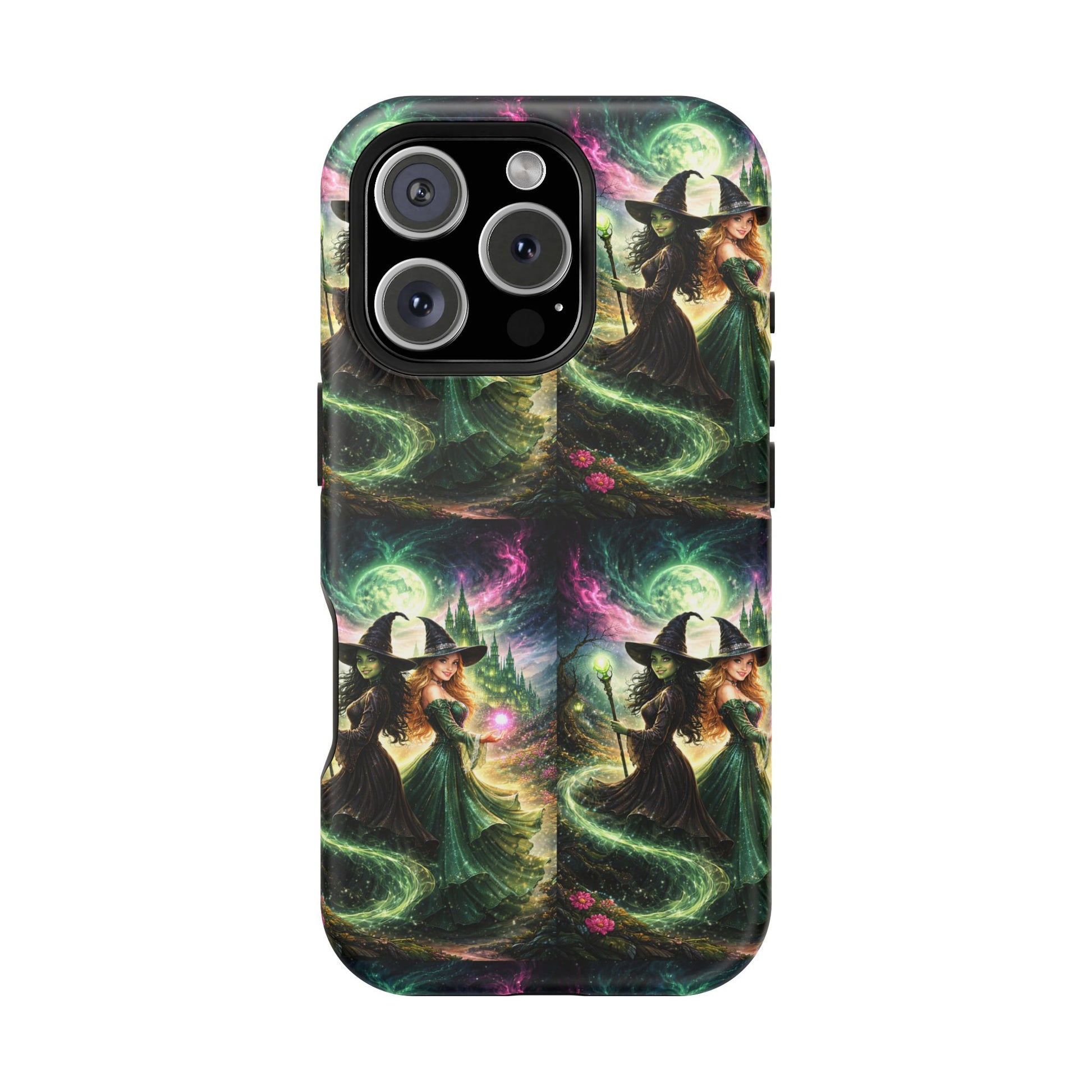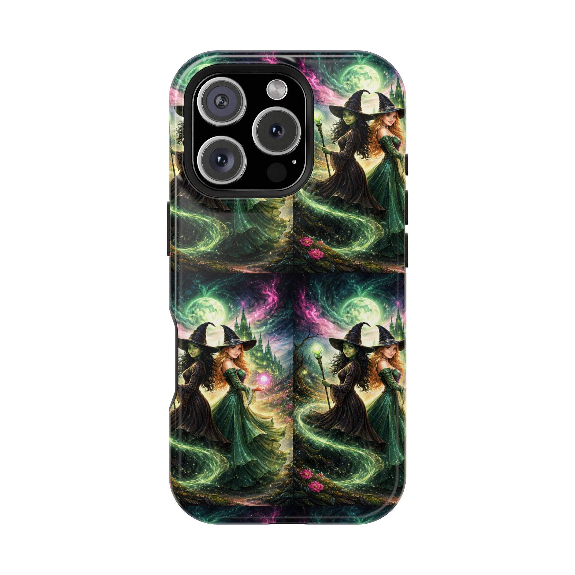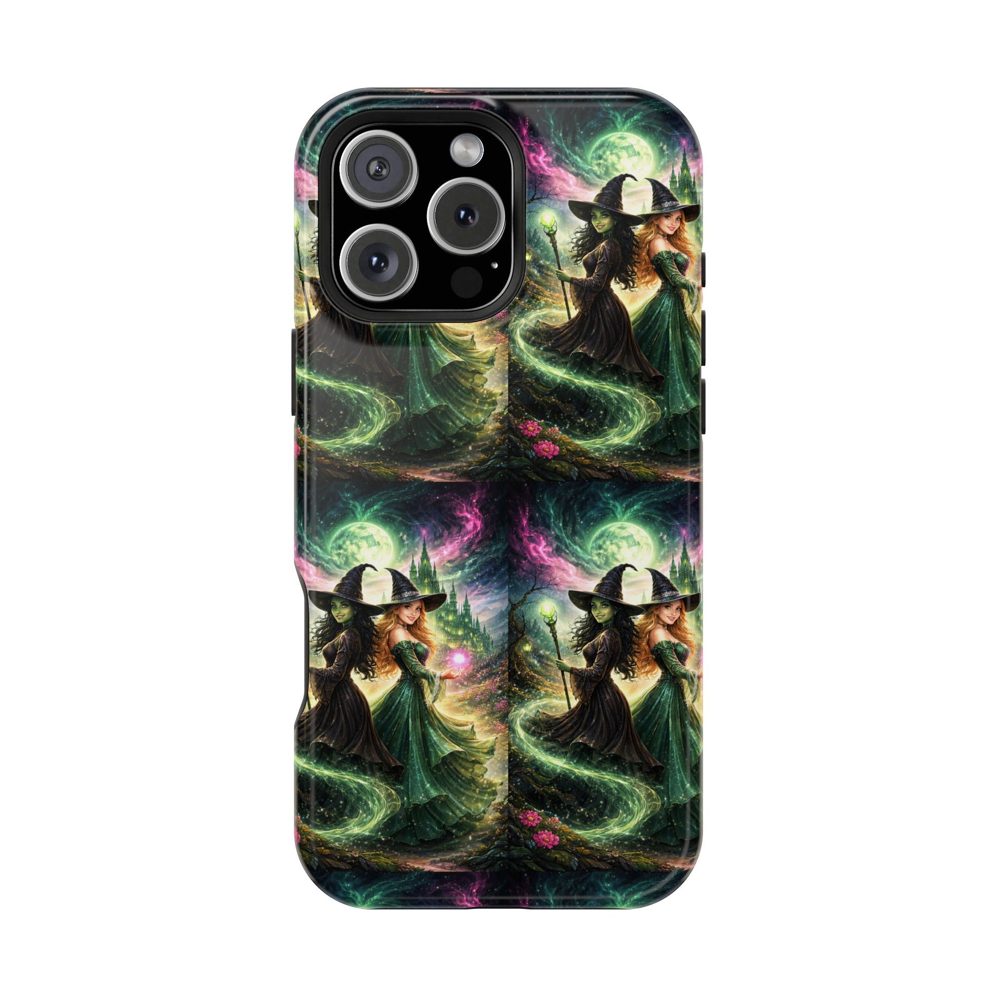 Hold a little bit of midnight magic in your hand. This impact-resistant phone case wraps your device in a swirling, witchy scene — moonlight, emerald spell trails, and a pair of mystic witches captured in jewel-toned detail. The print bleeds to the edges so the artwork feels continuous, while a snug black TPU inner layer cushions against shocks. Carry it on witch walks, forest nights, or while sketching tarot spreads at your favorite café. The glossy or matte finish options let you choose between a luminous, head-turning sheen or a softer, velvety look. Made to work with wireless charging and built for everyday life, it’s the kind of case that keeps your phone safe and your aesthetic loud.