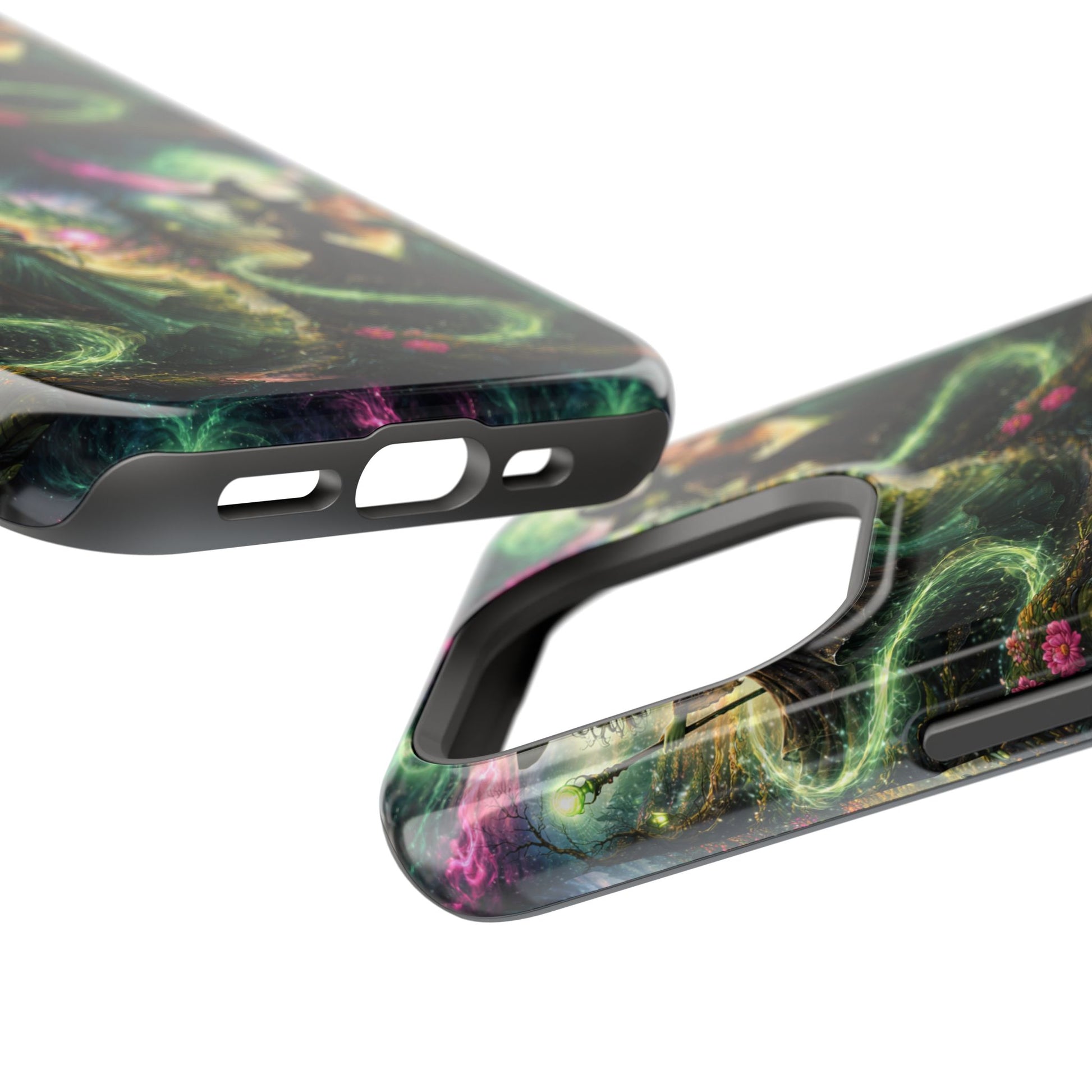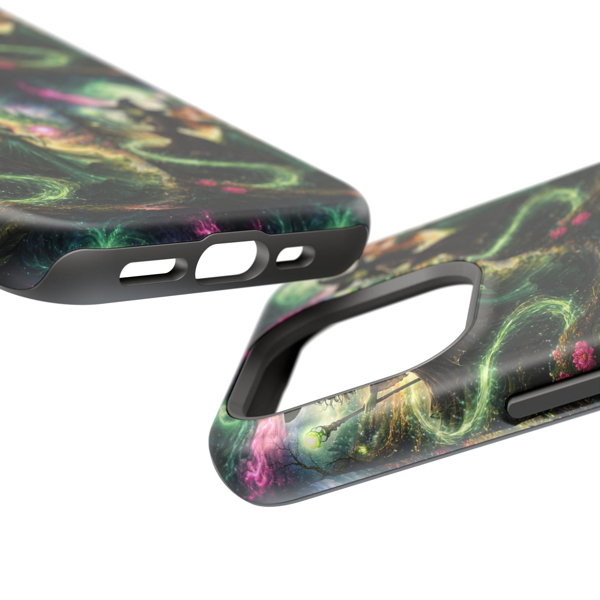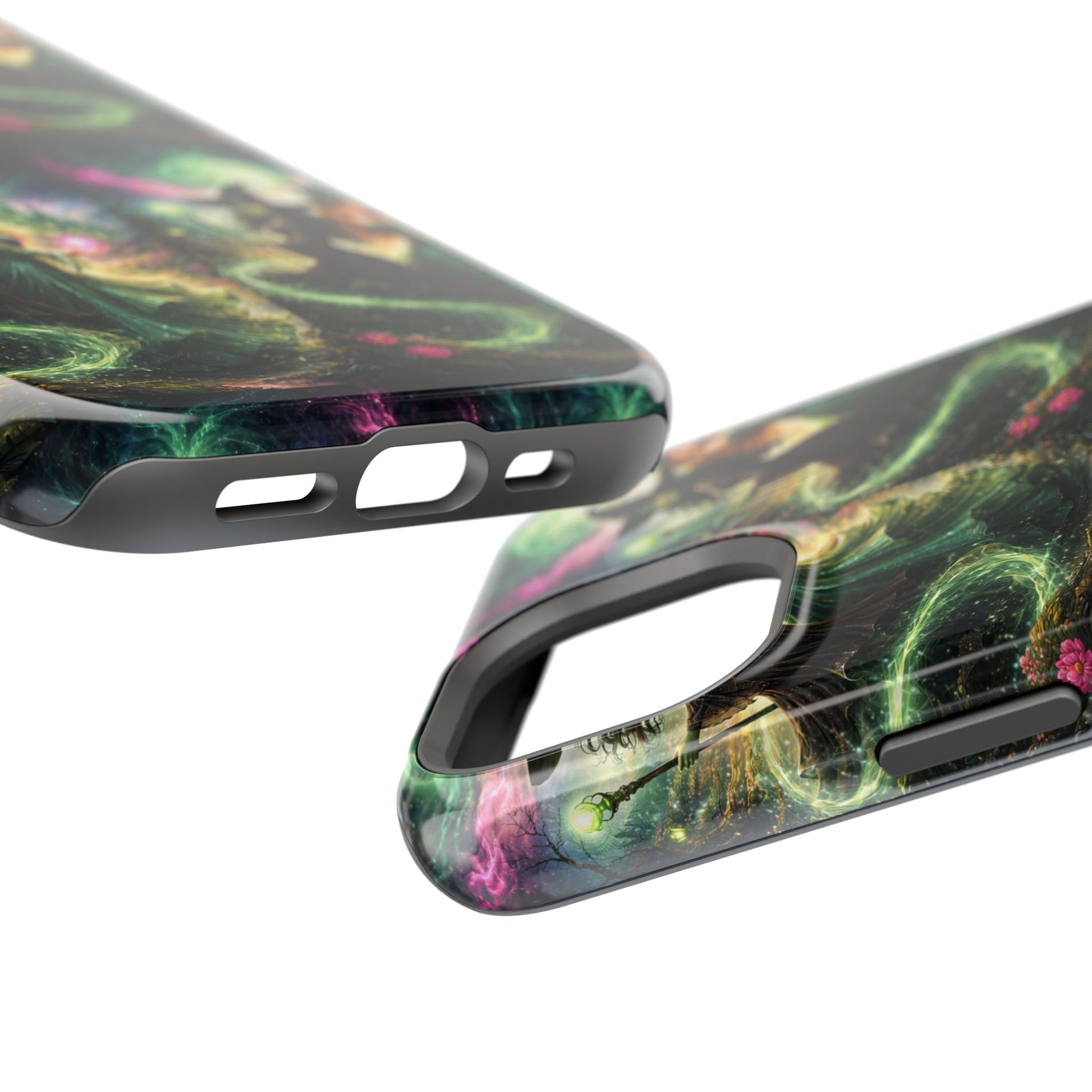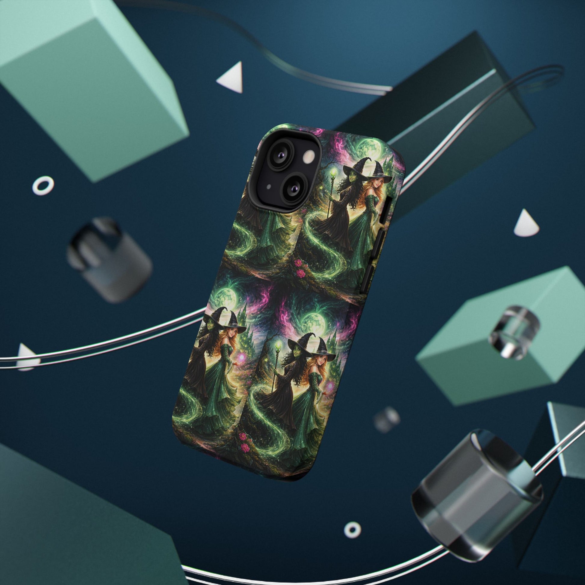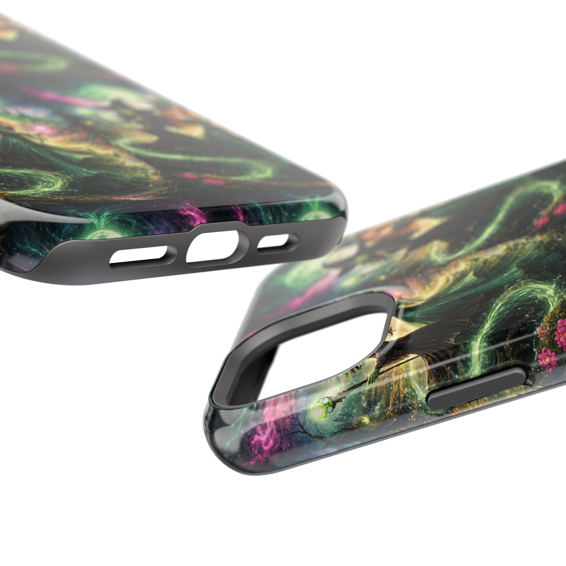 Hold a little bit of midnight magic in your hand. This impact-resistant phone case wraps your device in a swirling, witchy scene — moonlight, emerald spell trails, and a pair of mystic witches captured in jewel-toned detail. The print bleeds to the edges so the artwork feels continuous, while a snug black TPU inner layer cushions against shocks. Carry it on witch walks, forest nights, or while sketching tarot spreads at your favorite café. The glossy or matte finish options let you choose between a luminous, head-turning sheen or a softer, velvety look. Made to work with wireless charging and built for everyday life, it’s the kind of case that keeps your phone safe and your aesthetic loud.